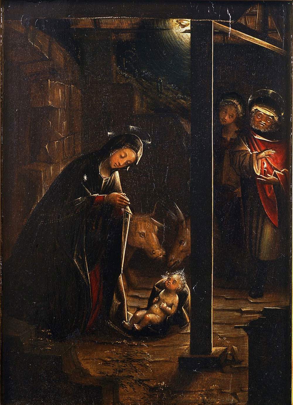 Curiosamente, e con la concretezza che gli derivava dall’esperienza, santa Brigida aggiunse che il ventre di Maria si ritrasse istantaneamente, tanto che il suo corpo ritornò «mirabilmente bello». L’iconografia della Natività accolse questo ed altri racconti mostrando la Vergine per nulla affaticata in adorazione del figlio ancor nudo e posto in terra: talora sopra un panno o su un lembo del suo manto, spesso entro una culla di luce. Giuseppe rimase talora in disparte e assopito, come nella predella dell’Adorazione dei magi di Gentile da Fabriano (1423) presso gli Uffizi di Firenze, dove una delle due levatrici (inutilmente convocate) si è invece accorta dello straordinario prodigio di quel bambino che illumina la notte. Anche nella tavola (1480 ca.) di Piero della Francesca alla National Gallery di Londra Giuseppe è scostato e assorto, mentre un canto di (concretissimi) angeli accompagna Maria che adora il suo bambino. Nella Natività di Defendente Ferrari (1510) al Museo Civico d’Arte Antica di Torino Giuseppe rientra nella capanna e, recando un lume, fa strada alla levatrice. La dolcissima Maria ignora entrambi e, inginocchiata, ammira il suo bambino dagli occhi vispi.