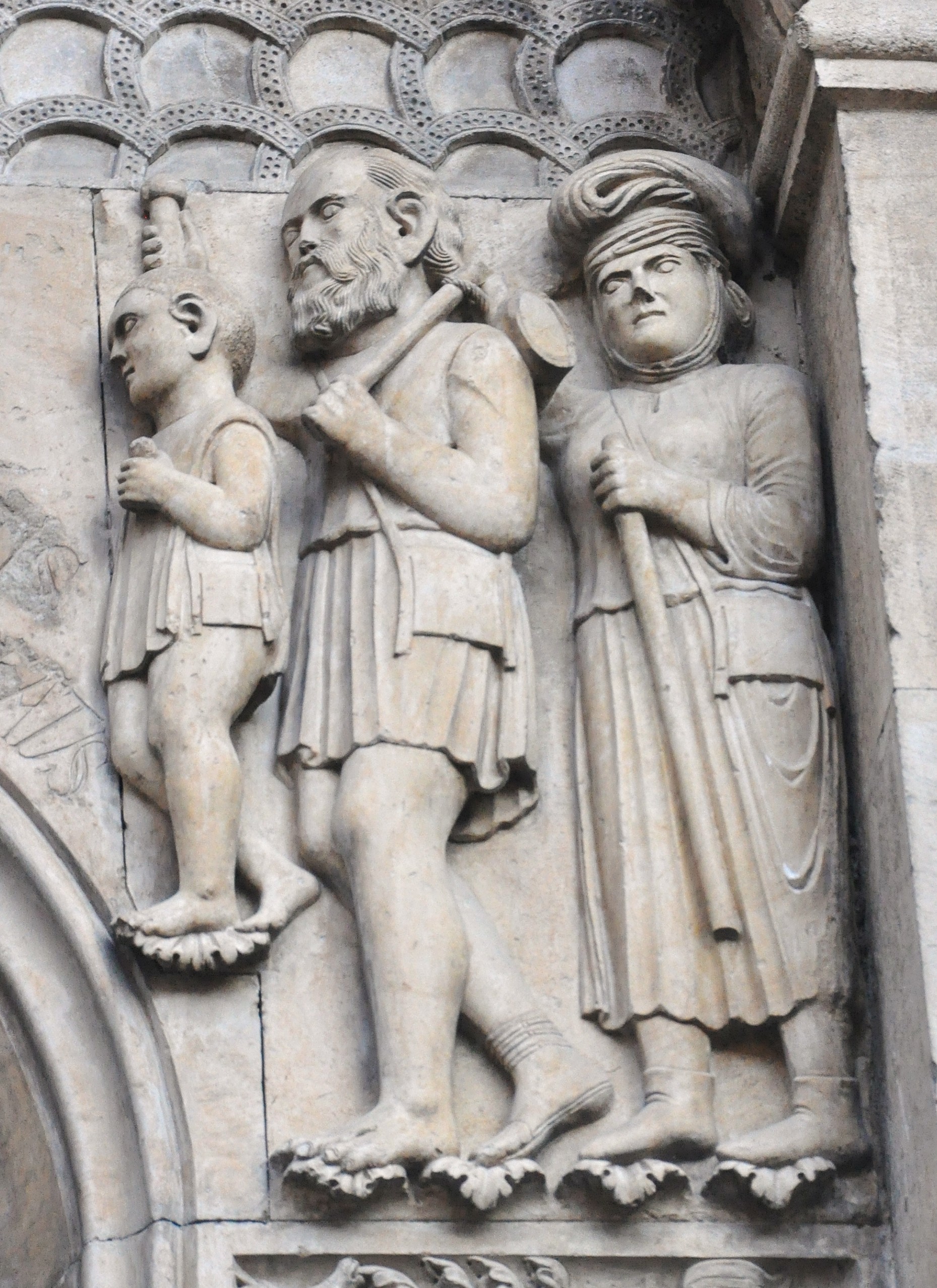 «La famiglia di pellegrini poveri», fine XII/inizio XIII secolo, Fidenza, esterno della chiesa di San Donnino