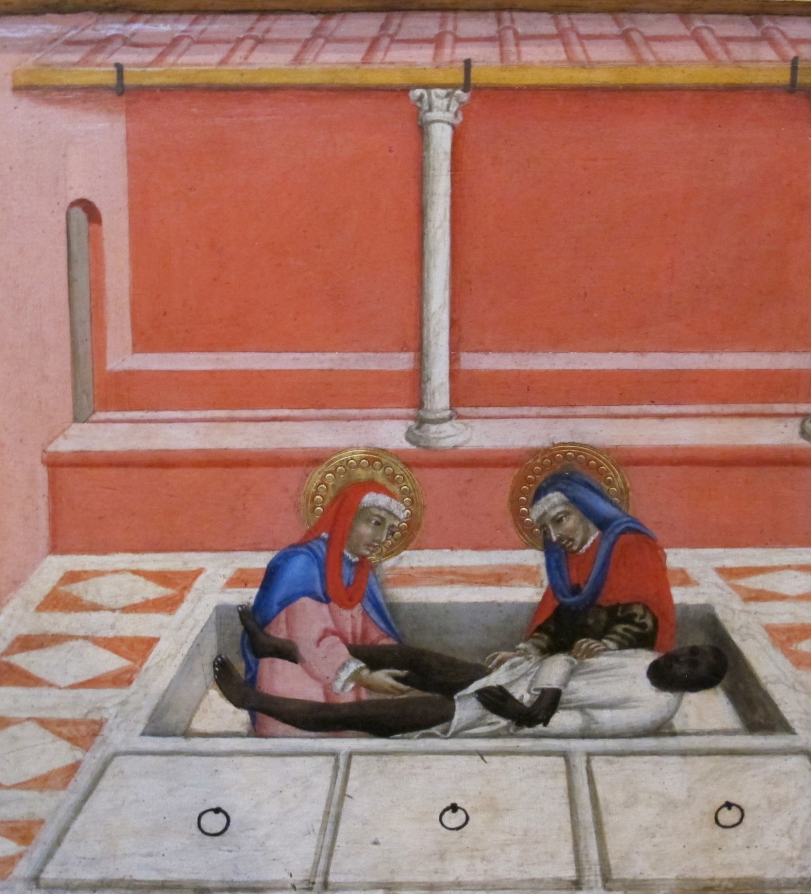 Quando il guardiano si svegliò, narra la Leggenda Aurea, «si alzò tutto felice dal letto e corse a raccontare a tutti in che modo era stato risanato», evidentemente non contrariato dal colore scuro della sua gamba nuova che i pittori solitamente accentuano, per rendere il miracolo più vistoso. Nella predella della pala dei Santi Cosma e Damiano (conservata alla Pinacoteca Nazionale di Siena e databile al 1460-70 ca), Sano di Pietro la raffigurò decisamente nera. Egli illustrò inoltre sia l’asportazione della gamba dall’etiope che l’applicazione al devoto dormiente. I due santi agiscono in pacata sincronia anche cromatica, l’uno con berretto rosso e mantello blu, l’altro con colori inversi. Nelle tavole superiori, stanti e grandi a lato della Vergine, indossano gli stessi abiti e impugnano con grazia una pinza e un bisturi, dorati come le scatoline degli strumenti chirurgici che entrambi, con l’altra mano, porgono.