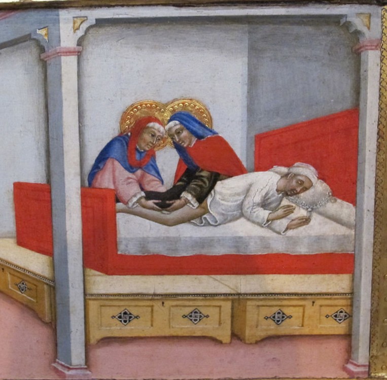 L’elegantissimo dottore che Buonamico Buffalmacco inserì nella catasta dei corpi falcidiati dalla morte, nel suo «Trionfo della morte» (1343 ca) al Camposanto di Pisa, era sicuramente un medico, poiché ancora stringe un vaso delle urine, che evidentemente non trovò cura per sé stesso dalla morte. Il medico Gabbadeo, protagonista di una delle Trecentonovelle di Franco Sacchetti, finisce per rovesciarsi addosso l’urina che una donna inferma gli aveva consegnato addirittura mentre era a cavallo; il medico Simone, che in una novella del Decameron di Giovanni Boccaccio è vittima della burla architettata dai pittori Bruno e Buffalmacco, aveva fatto dipingere «sopra l’uscio della via uno orinale, acciò che coloro che avessero del suo consiglio bisogno il sapessero riconoscer dagli altri». Piuttosto che rivolgersi a medici inetti come Gabbadeo e Simone, si ricorreva dunque ai santi. Nell’iconografia medievale i loro sepolcri sono infatti affollati: peggio di un pronto soccorso oggi.