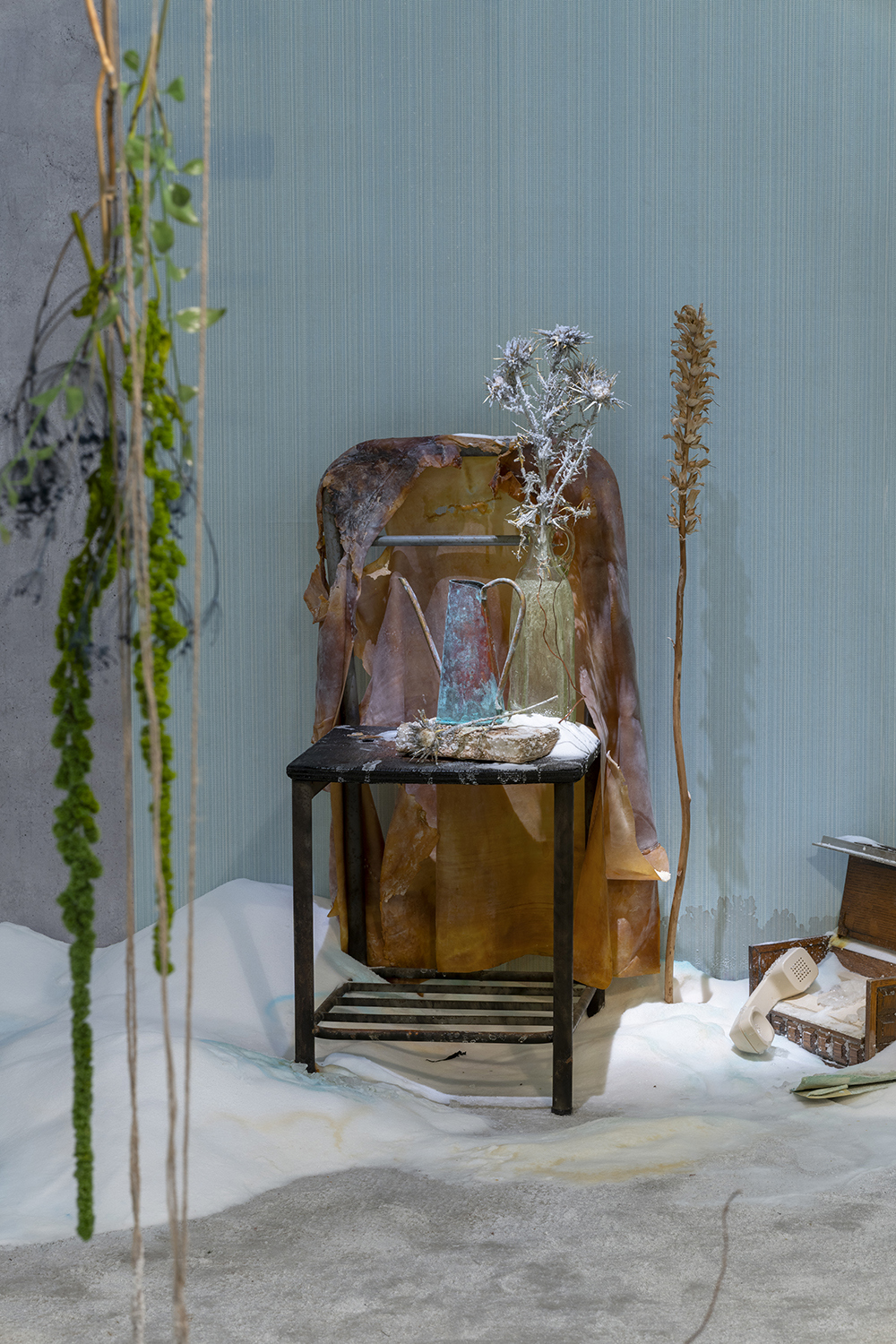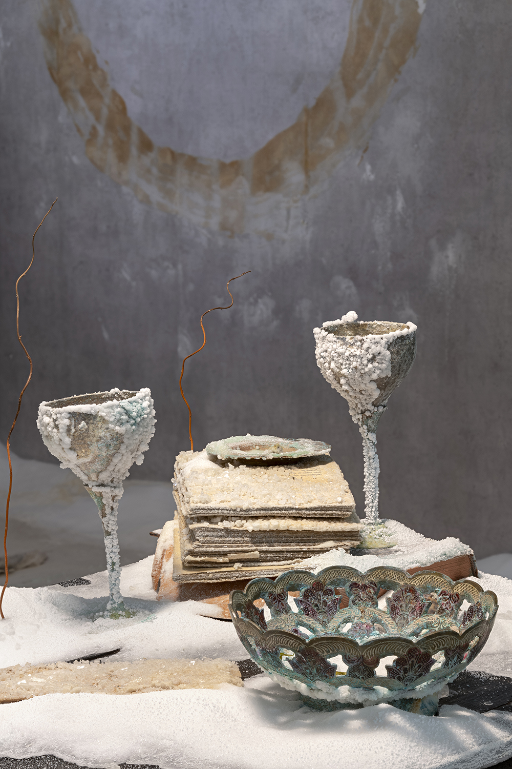 L’installazione immersiva «Silent House» di Bianca Bondi appare come una casa sospesa, un ecosistema mutevole, al tempo stesso familiare e distante. Gli oggetti, immobilizzati in un sottile strato di sale, sono sottoposti a continue reazioni chimiche. Tra cristallizzazione e metamorfosi, sono nature morte solo in apparenza, perché l’acqua salata le fa reagire, attivando trasformazioni quasi alchemiche dei materiali. Opere in perpetua evoluzione, attraverso le quali passa un’energia invisibile.