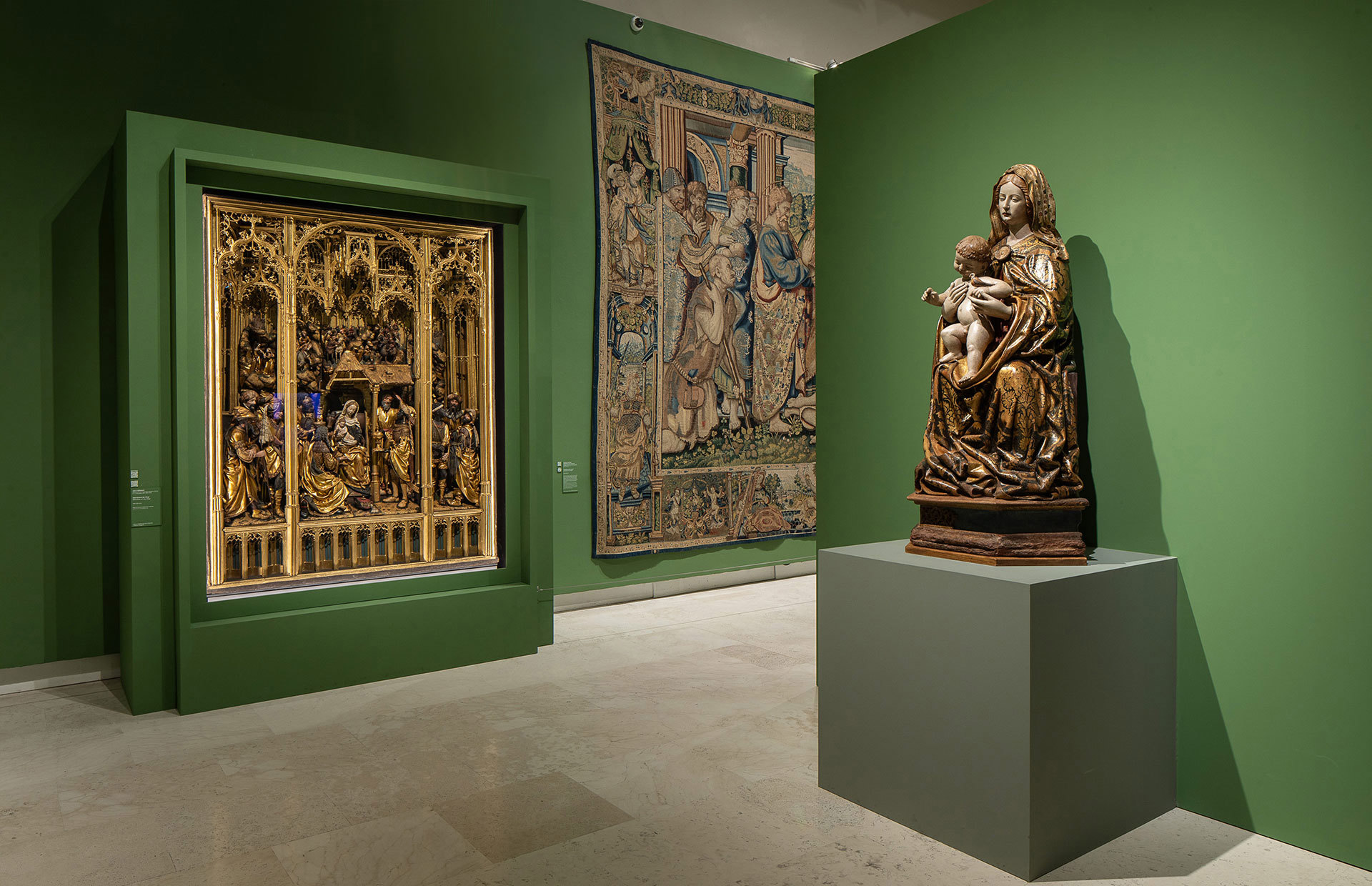Non meno venerato, è il prezioso reliquiario trecentesco di Sant’Orso, da Aosta, in lastra d’argento. È ora sfolgorante d’oro, l’ancona lignea con l’Adorazione dei Magi (XV secolo), dalla basilica dei Santi Apostoli e Nazaro Maggiore di Milano. Il restauro, che ha visto la collaborazione tra istituzioni italiane e belghe (Soprintendenza e Arcidiocesi di Milano, IRPA, Fondation Périer-d’Ieteren, Fondation Roi Baudouin), è stato eseguito tra il 2022 e il 2023 a Bruxelles presso l’Institut royal du Patrimoine artistique, e ha consentito di confermare l’attribuzione allo scultore Jan II Borman detto il Grande. La straordinaria policromia e l’apparato decorativo originali sono stati recuperati, celati com’erano al di sotto delle sovrammissioni ottocentesche: ridorature e una pesante vernice bruna. Il dettaglio del complesso restauro, di questa come di tutte le altre opere, è offerto dal catalogo cartaceo (285 pp.), mentre un resoconto ancora più minuzioso, con approfondite relazioni tecniche, si legge nel corposo catalogo generale online della mostra (774 pp.) Entrambe le pubblicazioni sono realizzate dalla Società Editrice Allemandi.
