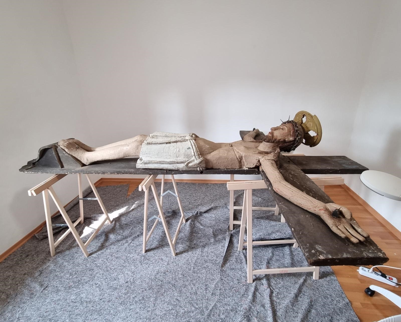 Il Cristo, un Christus Triumphans, dal volto smunto e malinconico, alto due metri e venti e collocato su una croce di tre metri e venti, si trova ora ricoverato nel Laboratorio di restauro per opere mobili allestito negli spazi del monastero di Santa Maria in Valle e a inizio agosto è stato sottoposto a una serie di indagini diagnostiche sotto la guida del restauratore Stefano Tracanelli, incaricato dal Comune di Cividale, sotto la sorveglianza della Soprintendenza del Friuli Venezia Giulia. Nel contempo le valutazioni storico artistiche hanno la supervisione scientifica di Luca Mor, storico dell’arte medievale, e esperto di scultura lignea medievale, autore dell’articolo citato sopra, che mantiene estremo riserbo sulla questione, ma ci anticipa: «Informazioni più complete, in particolare sui risultati delle indagini tecniche in corso, saranno presentate al pubblico insieme al Crocifisso nella prossima primavera con un evento istituzionale di primo piano, organizzato e promosso dal Comune con la probabile partecipazione di diversi enti regionali e nazionali».