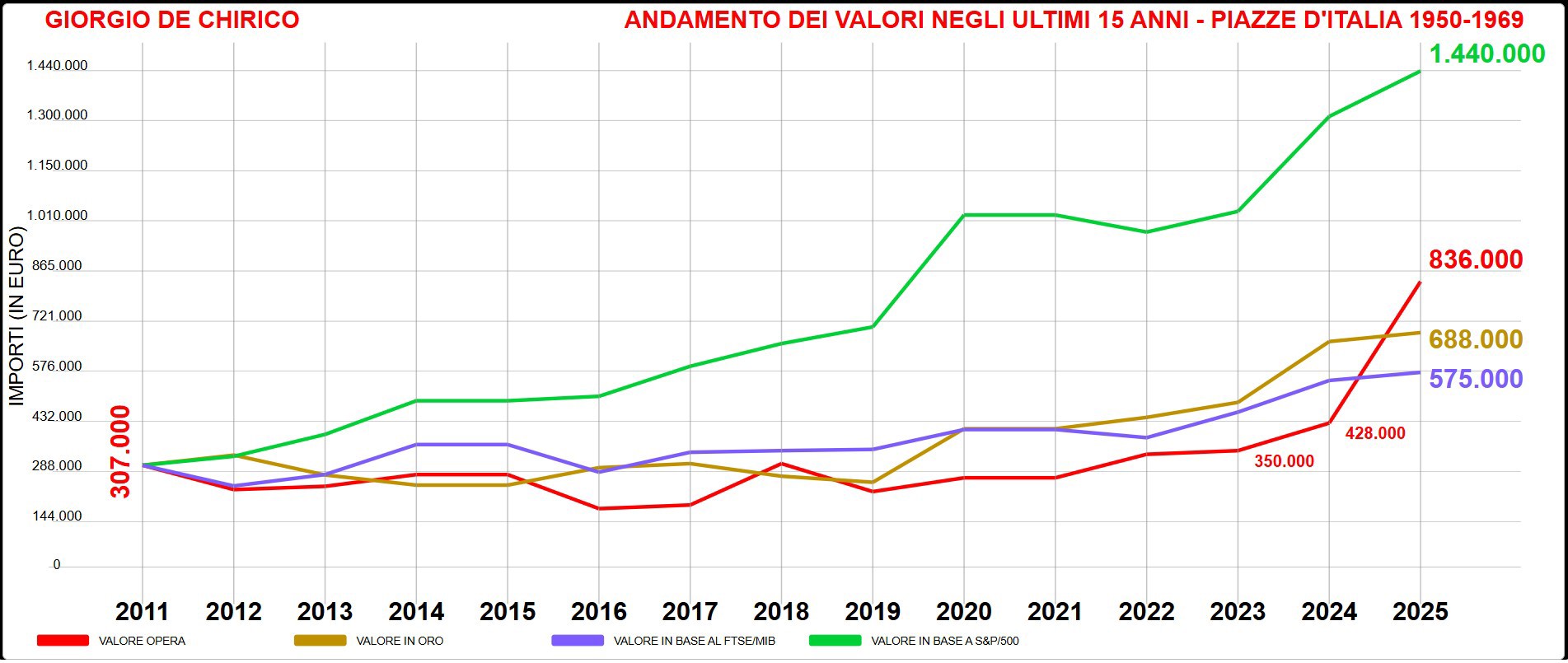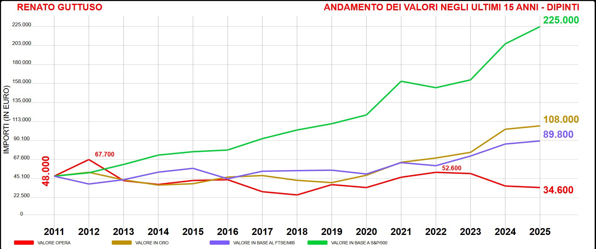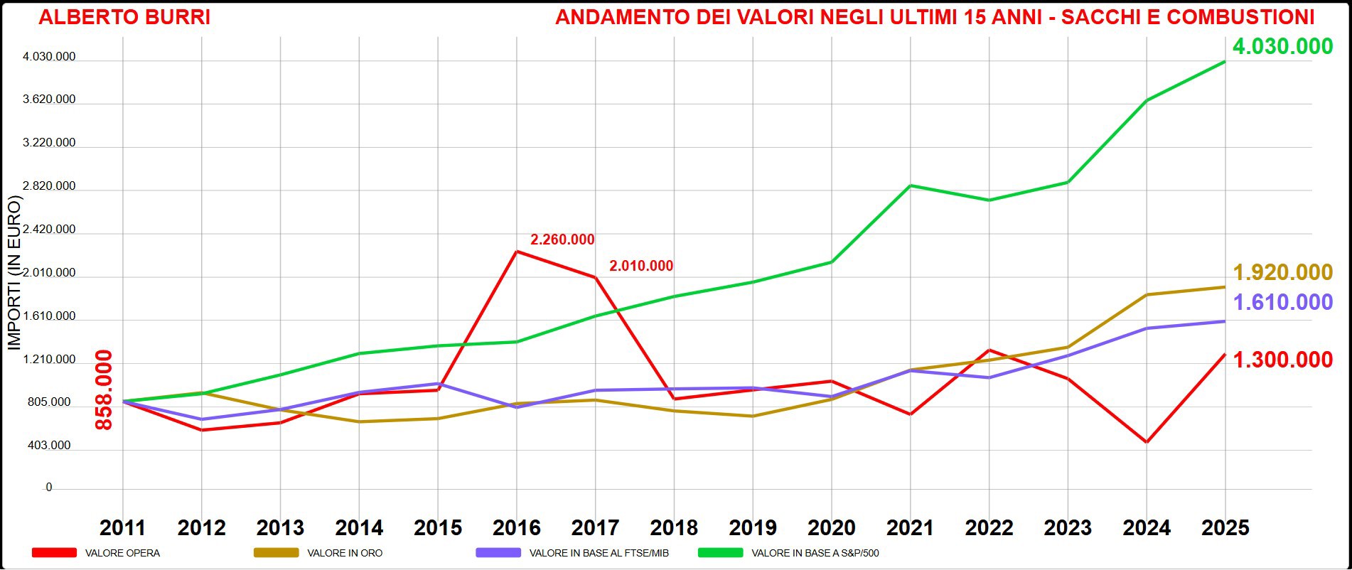 Attenzione. Gli indici mettono a confronto l’andamento degli artisti negli ultimi 15 anni rispetto a un particolare segmento del loro mercato (viene calcolata la media dei valori considerando i risultati delle case d’asta italiane e internazionali) con l’oro, la Borsa italiana (Ftse Mib) e la Borsa americana (Standard & Poor’s 500).