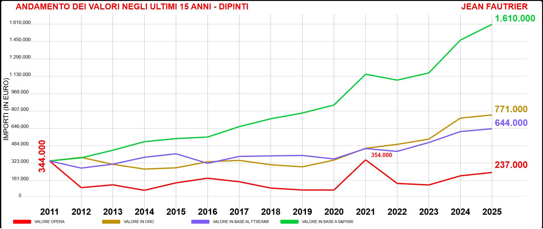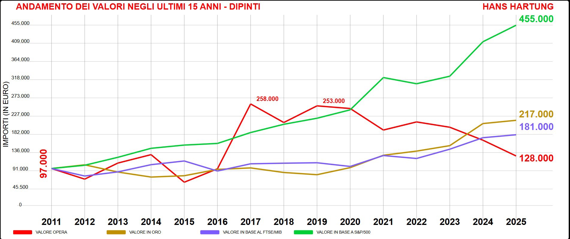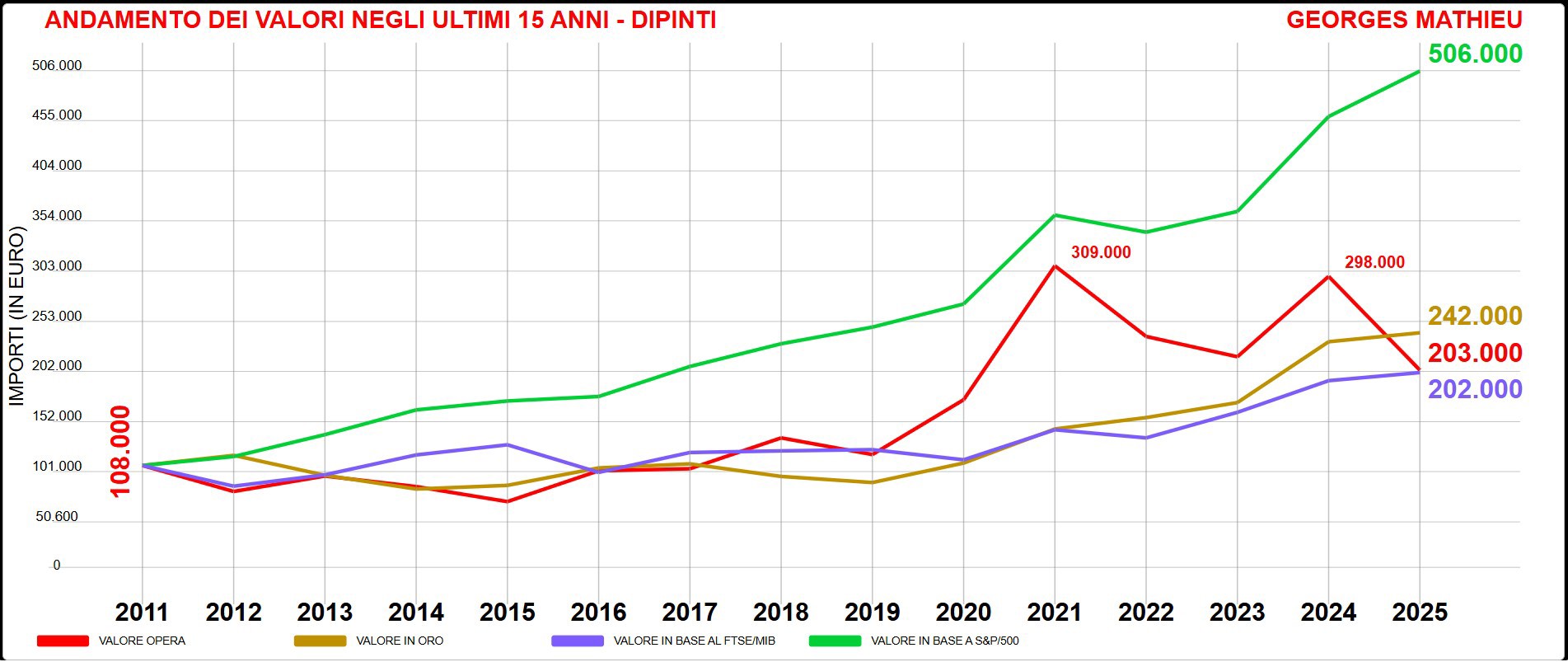 Tra gli artisti dell’Informale, Georges Mathieu (1921-2012) è il più resiliente. Dal 2011 al 2025 ha avuto un incremento complessivo dell’87%, nonostante l’ultima stagione sia partita in sordina. Se il confronto fosse stato proposto 12 mesi fa, il trend di crescita sarebbe decisamente superiore con +176%, surclassando l’andamento dell’oro e della Borsa italiana. Dopo un lungo periodo di silenzio, la pittura gestuale del francese è tornata alla ribalta nel 2021 con una serie di exploit tra cui il primato del 9 ottobre quando da Sotheby’s a Hong Kong «Tuz Gölü» del 1978, monumentale dipinto di 250x600 cm, è stato aggiudicato per 2 milioni di euro. L’Oriente è stato il trampolino di lancio per l’artista che alla tradizione giapponese, così come all’esperienza del Gruppo Gutaj, ha sempre guardato con interesse. La spinta speculativa del 2021 è apparsa eccessiva ma ora le acque si sono calmate consentendo d’intervenire sul mercato a cifre calmierate. Il 29 marzo 2025 da Christie’s a Hong Kong «Les yeux du jour», una composizione del 1987-88 (81x100 cm) ha cambiato proprietario per 112mila euro, circa la metà di quanto avrebbe potuto realizzare tre anni prima. Mathieu, dunque, è sceso dall’ottovolante e sembra giunto il momento per gli acquisti.