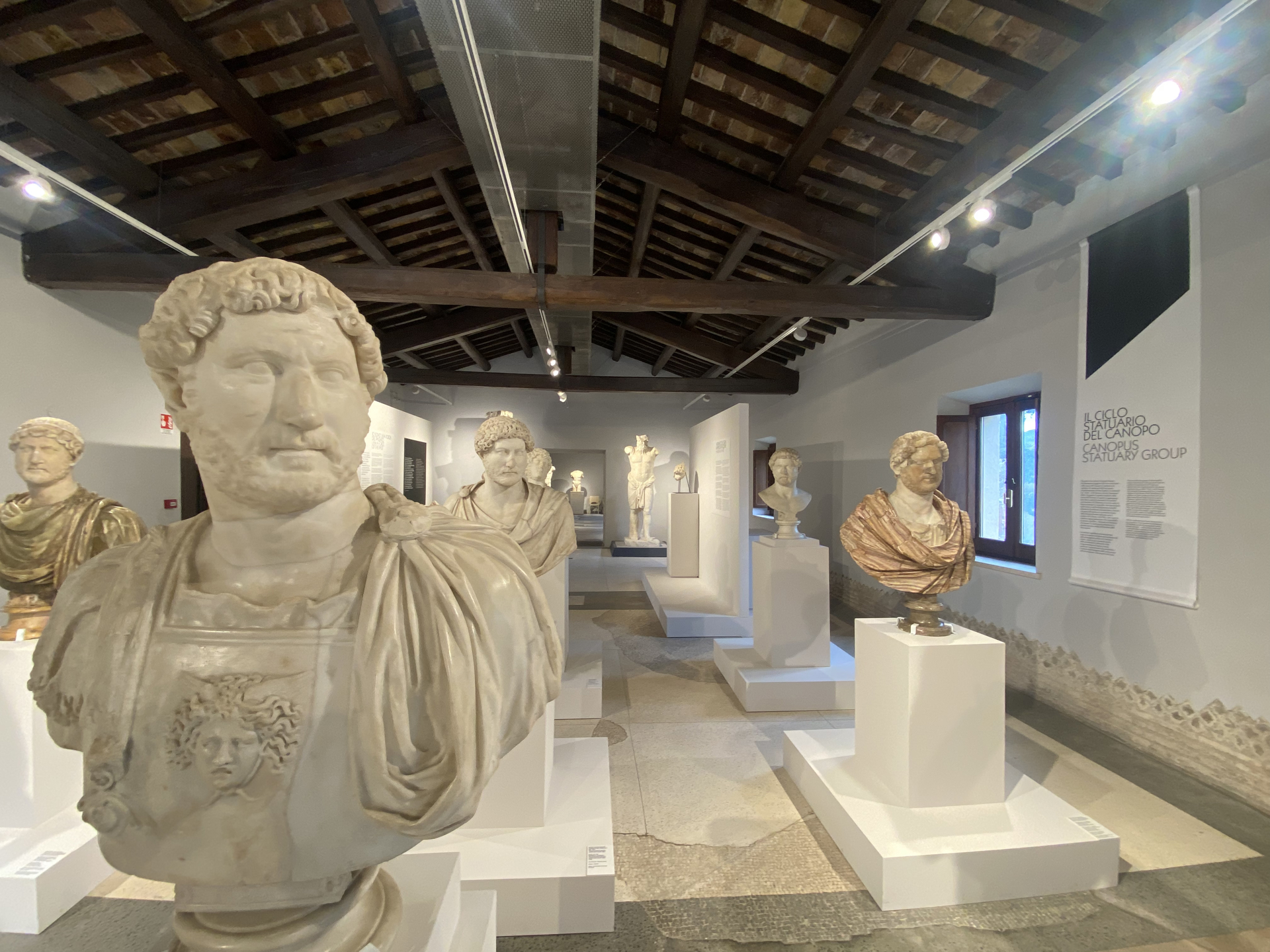 Veduta dell’allestimento della mostra «Io sono una forza del passato: Adriano, i ritratti», Tivoli, Villa Adriana, Mouseia (30 novembre 2023-5 maggio 2024, prorogata al 9 giugno 2024). Foto: Villae Tivoli