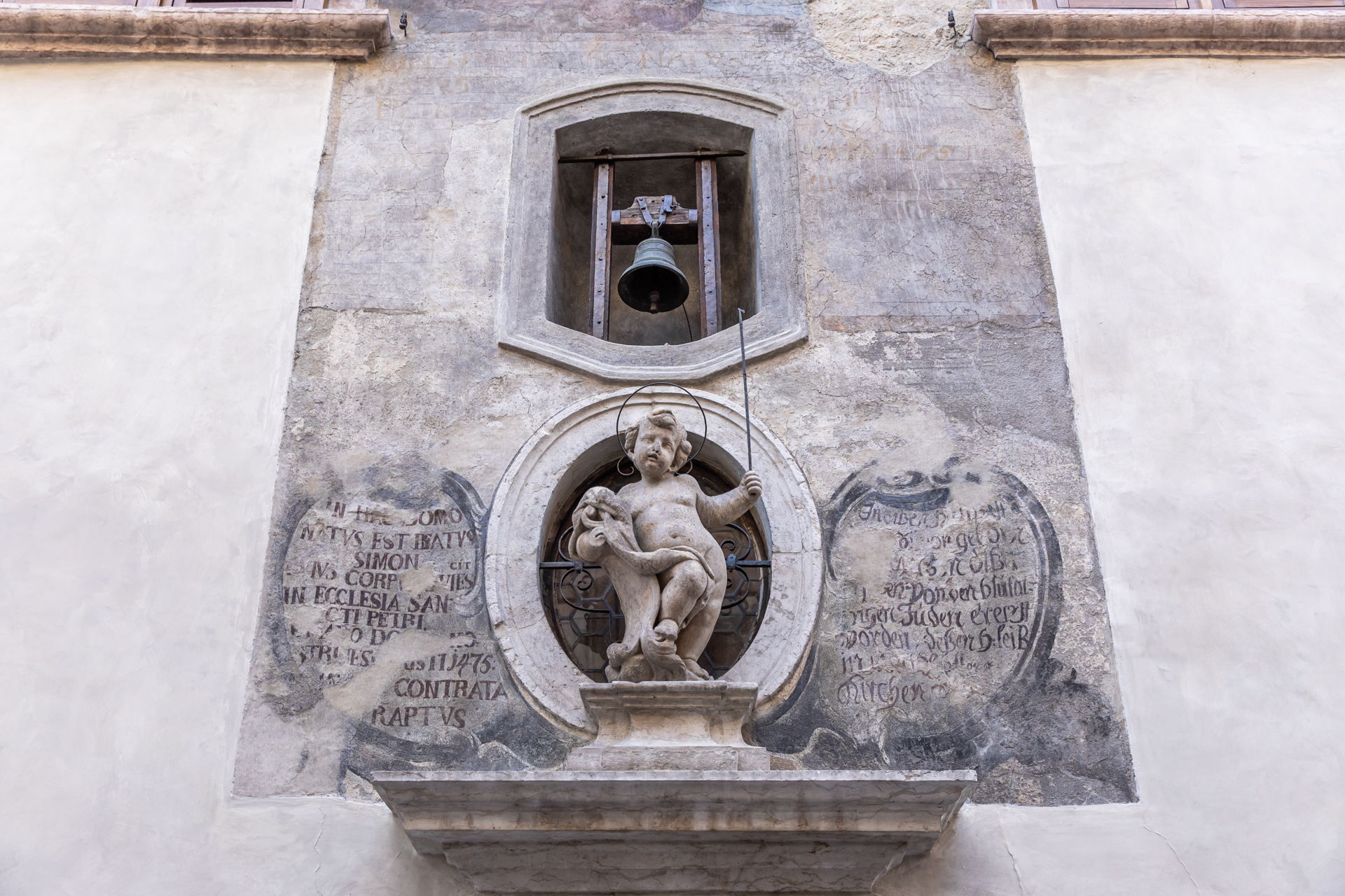 La cappella, oggi regolarmente aperta al pubblico, venne realizzata alla metà del Settecento e dedicata a «Simonino» in riferimento a Simone Lomferdorm, un bambino di due anni trovato morto nel 1475 in un fossato appartenente a un ebreo. La sua morte divenne il pretesto per una violenta campagna antisemita a Trento, culminata con un’infondata accusa di omicidio rituale nei confronti della comunità ebraica. Simone fu trasformato in un martire cristiano e la sua figura venne venerata per secoli. Gli ebrei trentini furono torturati, condannati e espulsi dalla città per cinquecento anni. La Chiesa ha soppresso il culto di Simonino solo nel 1965 e gli ebrei sono stati ufficialmente riammessi a Trento nel 1992.