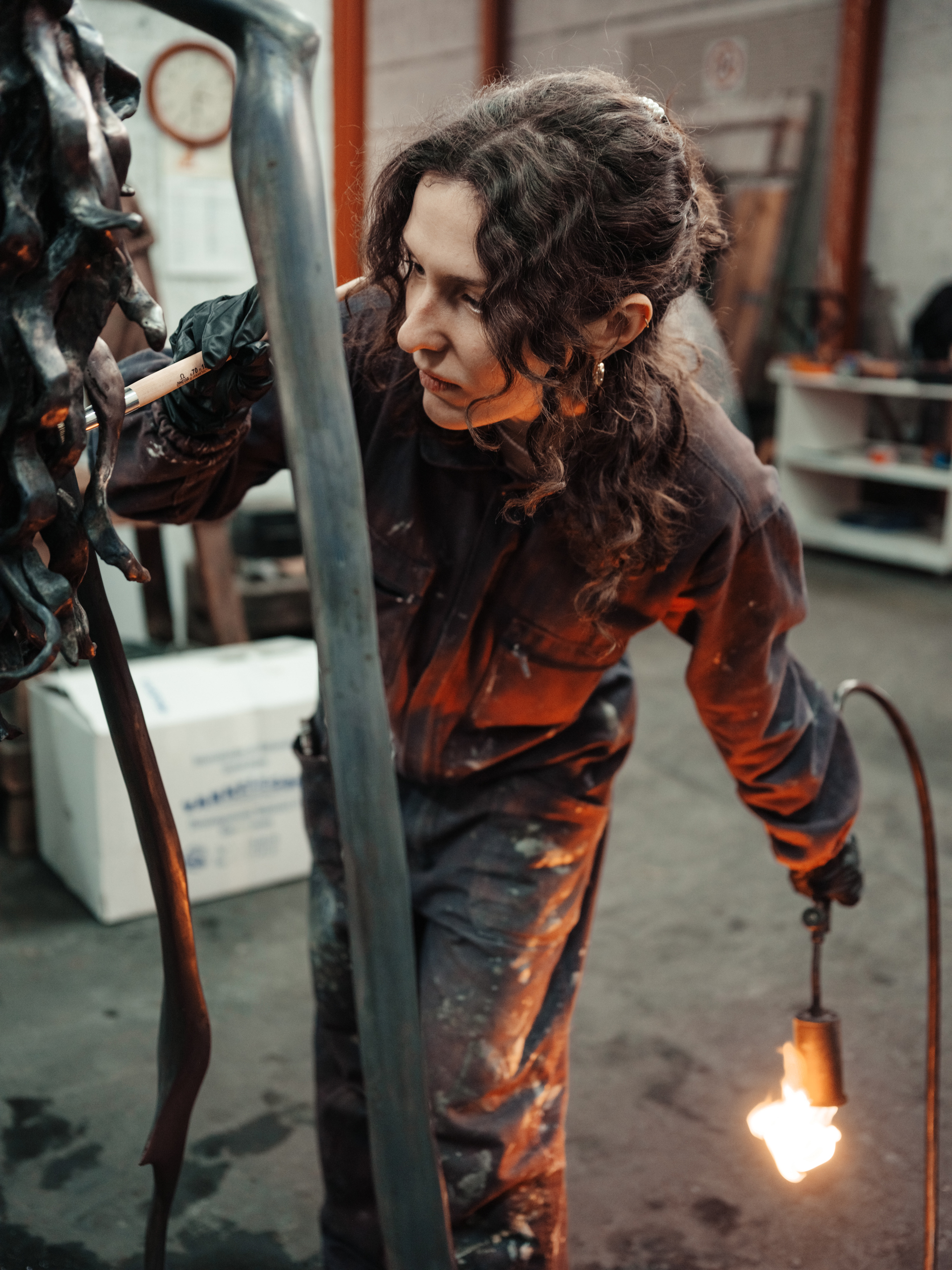 Apollinaria Broche al lavoro sulla sua scultura in bronzo alla Fonderia Versiliese, Pietrasanta