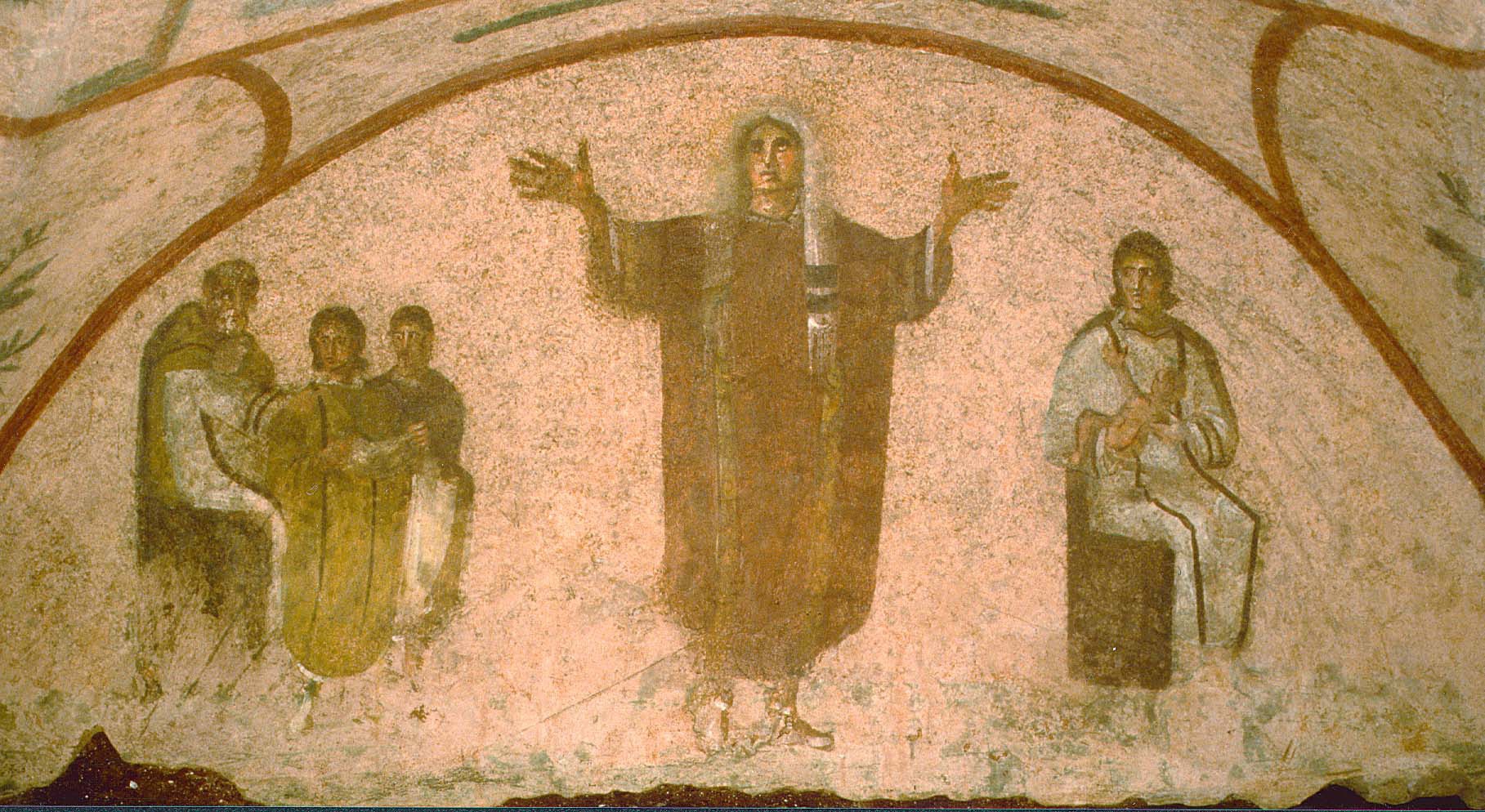 Roma, Catacombe di Priscilla. Cubicolo della Velata, scene di vita della defunta: a sinistra, il matrimonio, a destra, la maternità e, al centro, il passaggio alla vita ultraterrena (Archivio Fotografico Pcas)