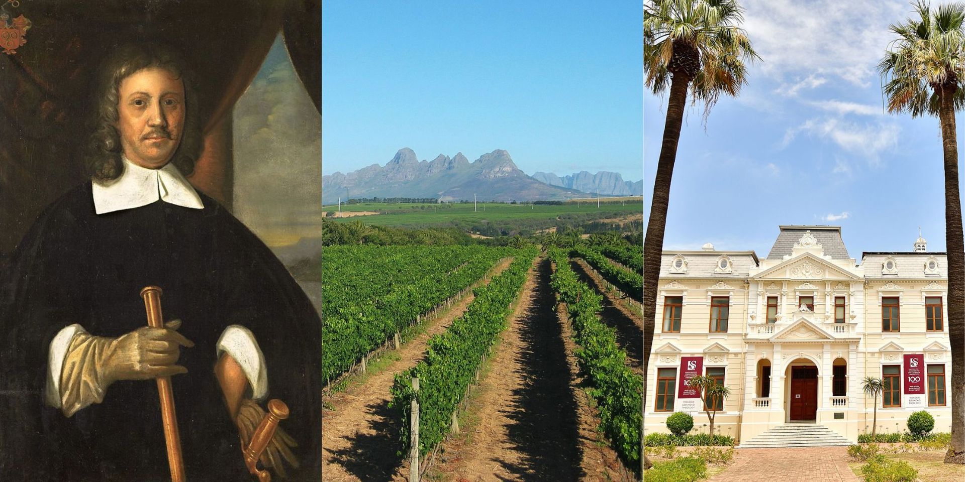 Da sinistra: un ritratto di Jan van Riebeeck; una veduta del paesaggio vinicolo che circonda gli edifici nello stile olandese del Capo; la sede dell’Università