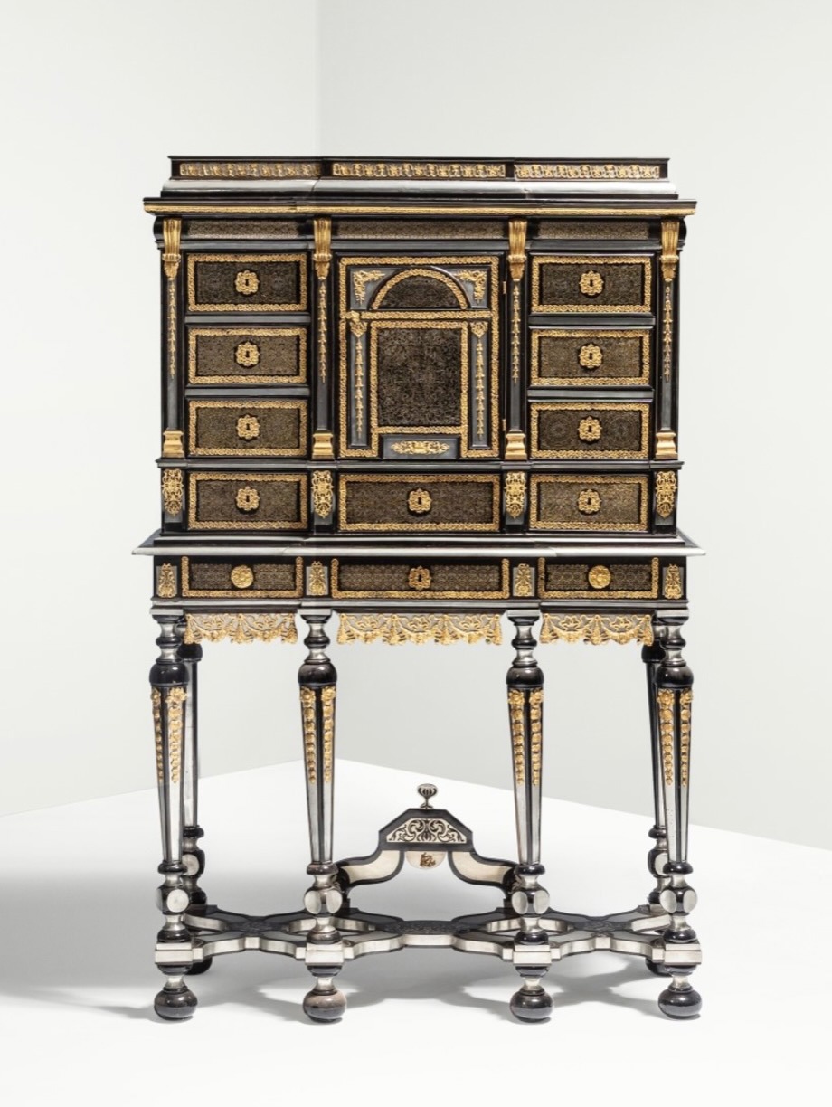 Armadietto Luigi XIV impiallacciato in peltro ed ebano, intarsiato in ottone e peltro, parquet ebanizzato e in legni esotici, intarsiato in tartaruga, osso e avorio, 1660-1680 ca. Cortesia di Sotheby’s