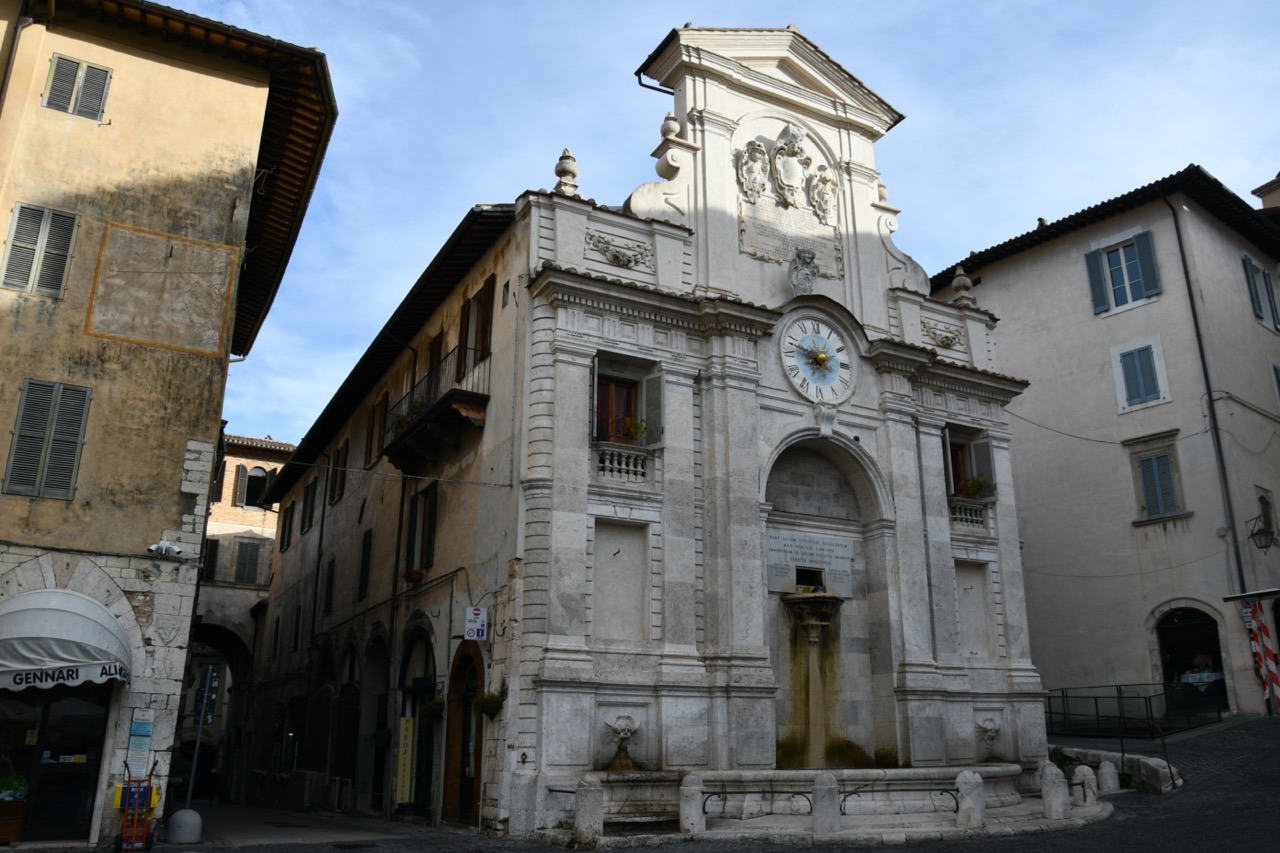La fontana di Piazza del mercato a Spoleto con lo stemma Barberini. Foto Barbara Antonetto