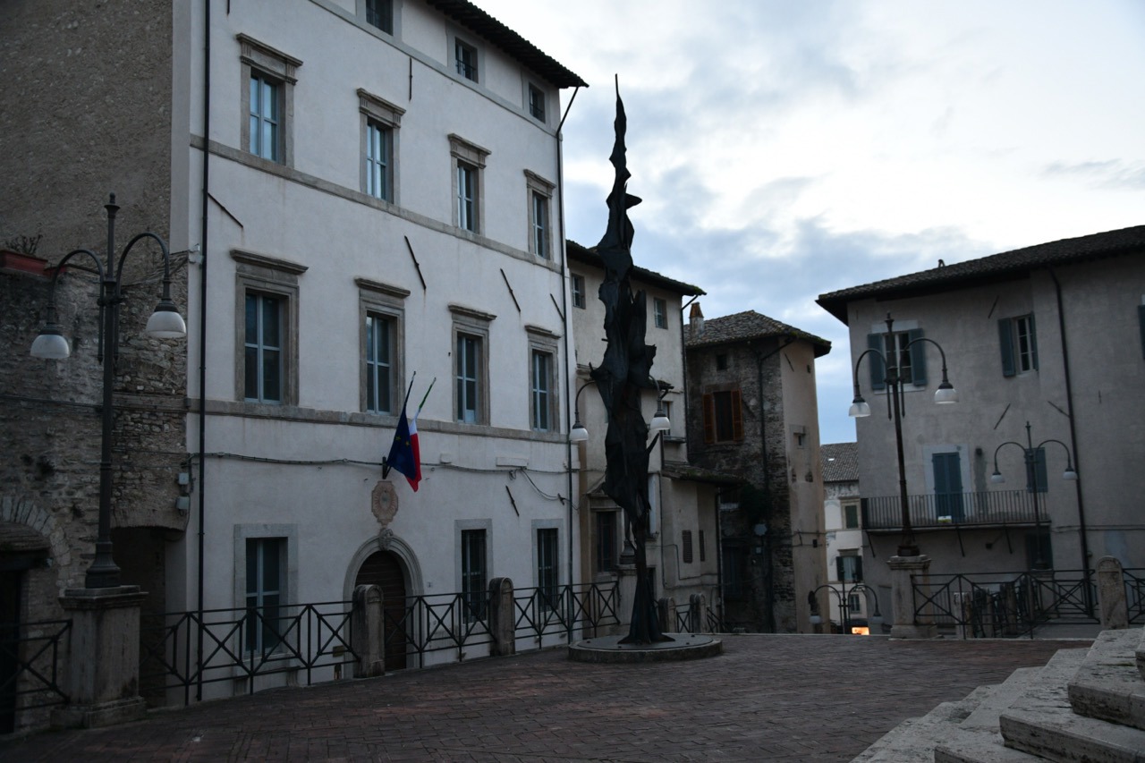 La Piazza del Comune di Spoleto con la scultura «Spoleto 1962» di Nino Franchina. Foto Barbara Antonetto