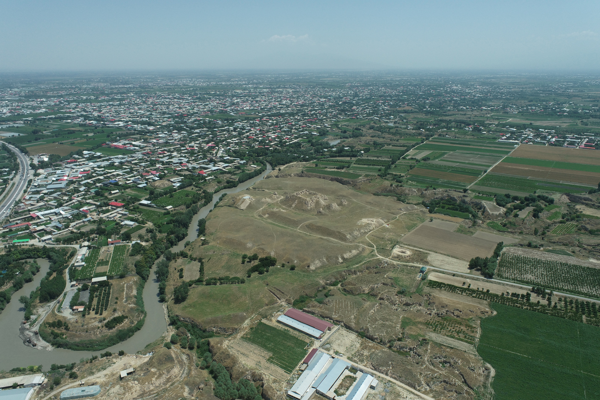 Vista aerea del complesso archeologico di Kafir Kala, a sinistra il canale Dargom, 2024. © Iicas, Paiu