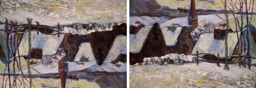 Paul Gauguin, «Villaggio bretone sotto la neve» (1894), a destra il modo «corretto» di appenderlo. Foto: Autour de l’impressionnisme
