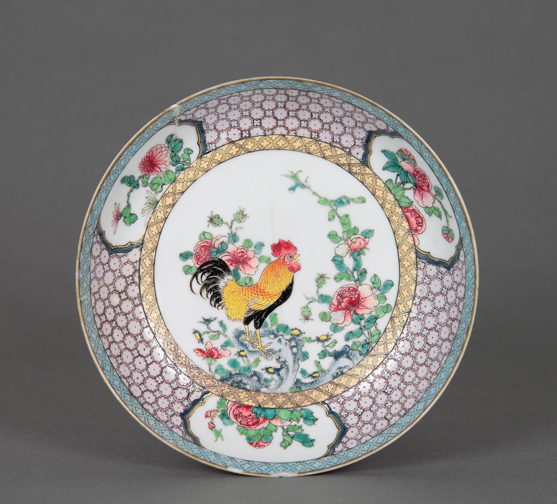 Piatto con pollo tra piante fiorite, Cina, Jingdezhen, periodo Qing, Yongzheng (1722-35), donazione Alfonso Orombelli, 1948