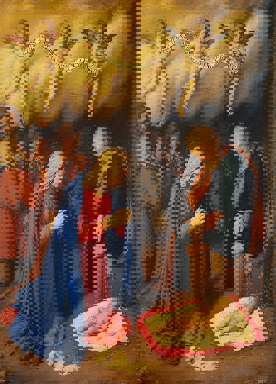 Leggi i suoi articoliDentro una luce dorata e con una piccola musica il nostro Natale 2025 lo festeggeremo al Museo di Capodimonte. Tre pastori sono inginocchiati in adorazione del Bambino. Uno porta un agnello sulle spalle a mo’ di zaino; l’altro modula il flauto (uno scugnizzo come quelli dipinti da Le Nain). L’ultimo, indietro a tutti, ha il bastone. A centro pagina sbuca il muso dell’asino inquadrato dalla cavezza (subito dietro il bue). In rosa, blu e bianco la Vergine prega sul Bambino; è in compagnia di Giuseppe, disorientato, come ripiegato. In alto un trio di angeli diversamente sgambettanti srotola le prime parole dell’inno alla nascita di Gesù.