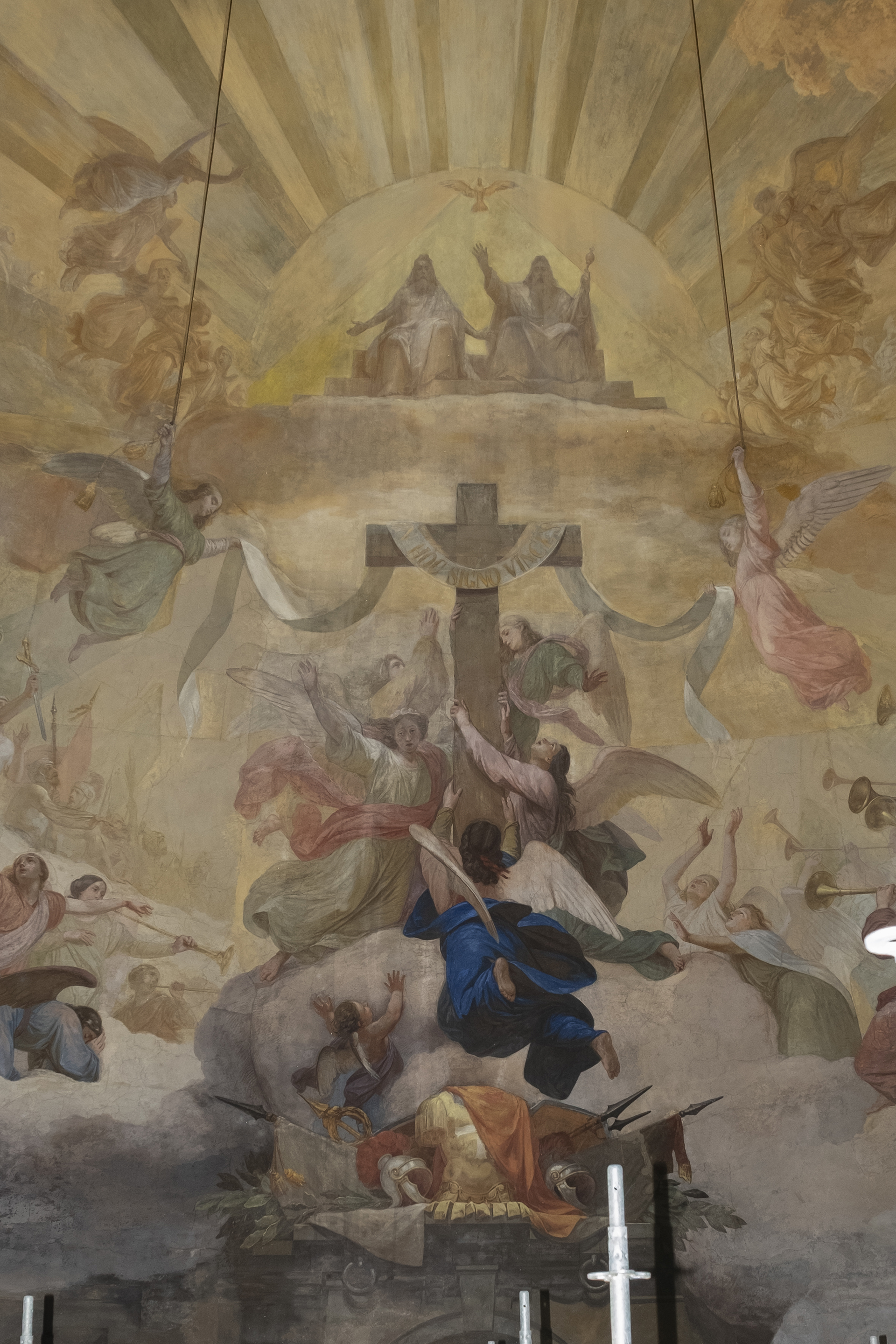 Con la sua équipe di 4-5 persone la restauratrice Alina Pastorini ha consolidato la pellicola pittorica con la nanocalce che assicura coesione e adesione all’intonaco, dopodiché ha proceduto alla pulitura realizzata con trattamenti a base acquosa. Prima di questo intervento sono stati condotti accurati studi nell’Archivio Storico Mauriziano, che tra il resto hanno permesso di chiarire i tempi del cantiere: 21 mesi alla firma del contratto e non 8 come si legge nelle cronache dell’epoca. Il soggetto degli affreschi è il Trionfo della Croce popolato di oltre trecento figure e suddiviso in quattro scene: la caduta, avvolta dalle tenebre, del tempio pagano degli idoli, l’ascensione della croce verso la Trinità in piena luce, Maurizio e Lazzaro sollevati da schiere di angeli e una figura velata che viene svelata a simboleggiare il mondo dei credenti, il tutto realizzato con tratteggi raffinati e una tavolozza di colori molto ricca.