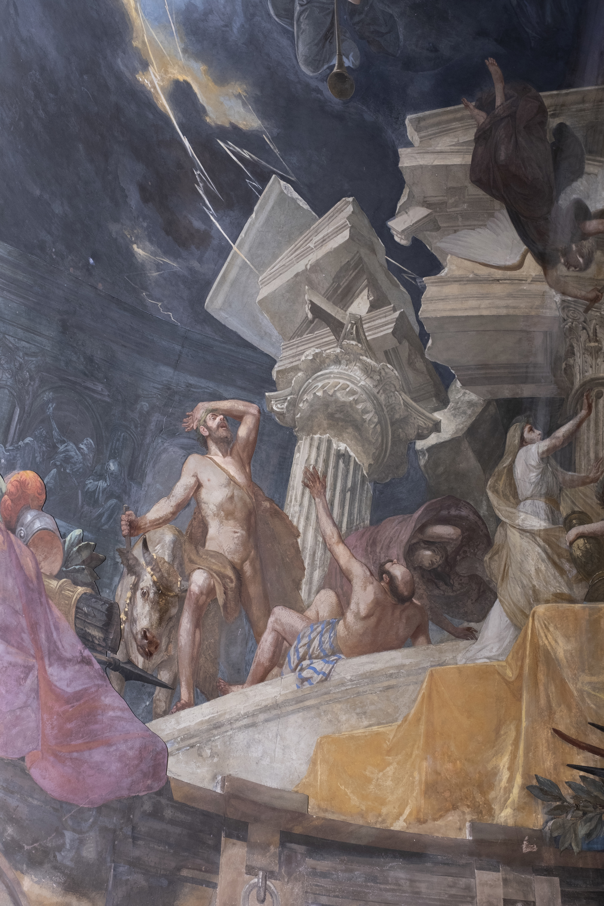 La funzionaria Valeria Moratti ha sottolineato che i restauratori al lavoro sui ponteggi a 40 metri di altezza hanno constatato con mano la modernità della sua tecnica. L’affresco è stato infatti realizzato in modo tradizionale (il disegno dei cartoni è stato trasferito sull’intonaco bagnato incidendo i contorni con una sgorbia e poi la stesura del colore è avvenuta suddividendo il lavoro in giornate), ma Paolo Emilio dipinse le mani delle figure di getto (senza preventivamente disegnarle) e appose sull’affresco delle finiture a secco ed elementi polimaterici in rilievo di dimensioni non comuni, come le armature in legno in primo piano o le corde in canapa che escono fisicamente dalle mani degli angeli affrescati per andare ad azionare un grande telo in origine appeso al colmo della cupola per oscurare la luce proveniente dal lanternino, un espediente di cui non si conoscono altri esempi.