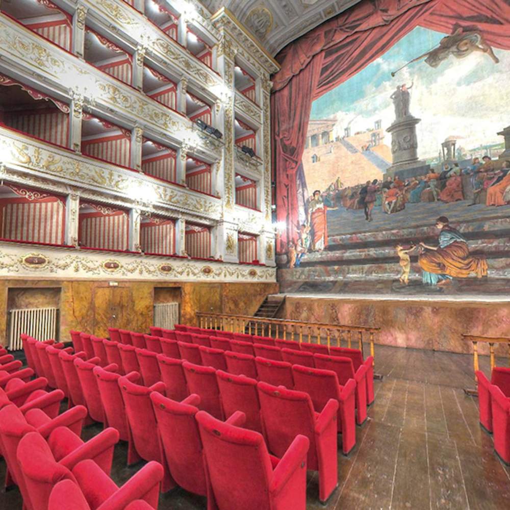 Percorrendo da qui l’antica via Flaminia e addentrandoci verso l’Appennino, giungiamo all’elegante Cagli con il suo Teatro Comunale costruito fra il 1870 e il 1878. Qui si impone lo stile eclettico e il superamento di ogni nostalgia neoclassica: la sala, armoniosa nelle sue proporzioni, dispone di 50 palchi disposti su tre ordini e sovrastante loggione a balconata aperta. La sala principale è tutto un susseguirsi di stucchi dorati, mensole, volute, sfingi, cornici, fregi e intagli, mentre il palcoscenico presenta ancora oggi i vecchi dispositivi di manovra come i carrelli per lo spostamento delle quinte, carrucole e tiri, una macchina per le luci a soluzione salina, un sipario comodino con apertura per l’uscita degli artisti e ben nove scene complete di fondali e quinte costituenti il corredo originale.