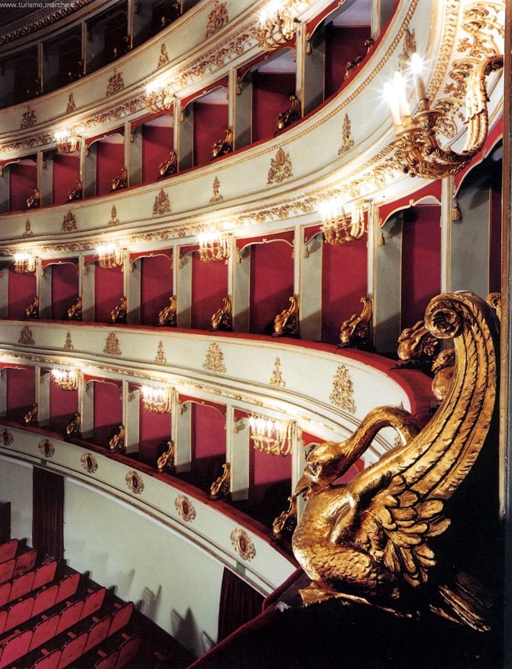 L’itinerario prosegue con un’altra perla, la vicina città romana di Fano e il suo celebre Teatro della Fortuna, eretto fra il 1665 e il 1677, opera del più famoso fra gli scenografi e scenotecnici del Barocco, il fanese Giacomo Torelli. L’attuale edificio viene costruito invece fra il 1845 e il 1863 ed è giudicato il capolavoro dell’architetto modenese Luigi Poletti per la perfezione raggiunta nelle forme architettoniche e l’armonia tra masse e linee. Imponente e severo, lungo il perimetro a ferro di cavallo della platea si trova l’alto basamento anfiteatrale che regge la sporgenza del primo ordine di palchi (21), ampia e decorata, fra palco e palco, da piccole sfingi alate.