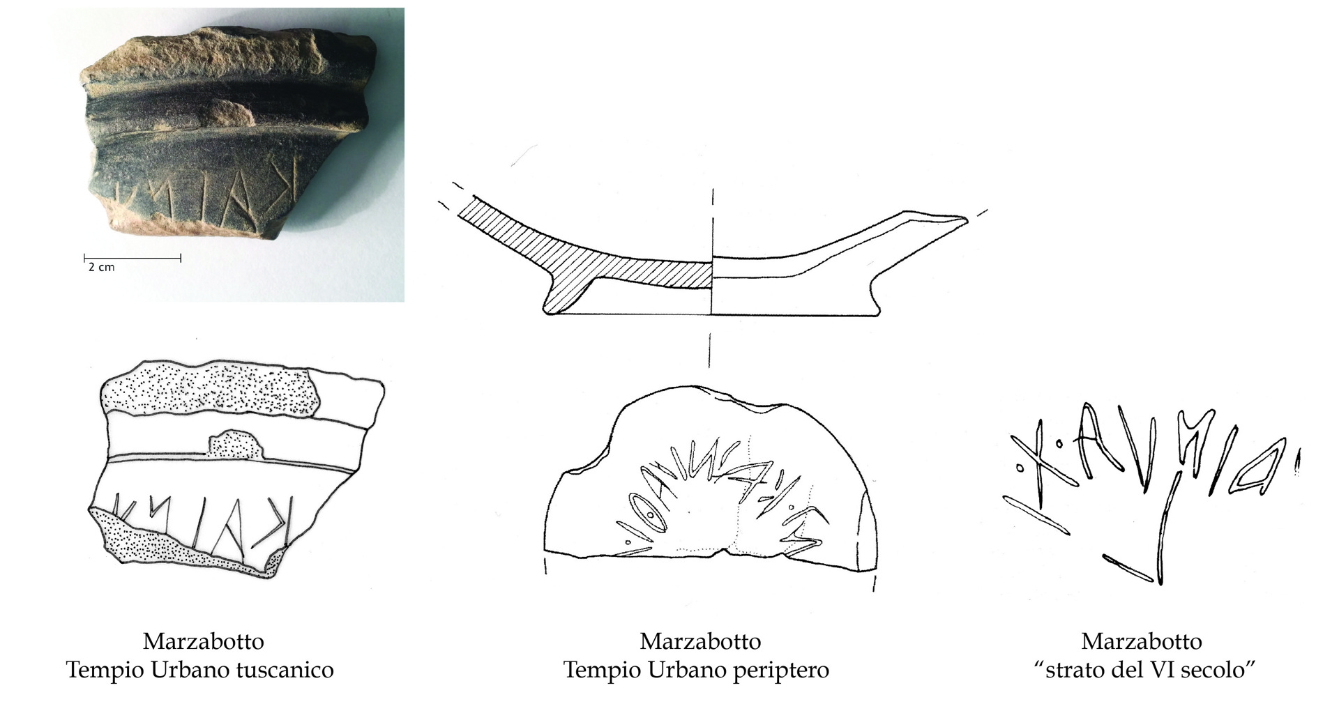 Gli scavi hanno consentito di ricostruire i riti di fondazione dei due templi e, in particolare, di quello dedicato a Uni, il più antico e costruito alla fine del VI secolo a.C. Un’iscrizione, rinvenuta tra i sassi delle fondazioni murarie, documenta un rito solenne, probabilmente una libagione, a cui prese parte l’intera comunità. Altrettanto solenne dovette essere il rito di fondazione del tempio più recente, anche in questo caso venne ricordato in un’iscrizione incisa su una lamina di bronzo destinata in origine a essere affissa per tramandare la memoria dell’evento. Le dimensioni dei due edifici erano ragguardevoli: quello di Uni aveva una superficie pari a 492 metri quadrati, l’altro raggiungeva i 780 metri quadrati. Si tratta di un grande investimento nella sfera del sacro con risvolti nell’architettura, nelle pratiche devozionali e nella scrittura che avvicina Marzabotto al circuito dei grandi santuari etruschi.