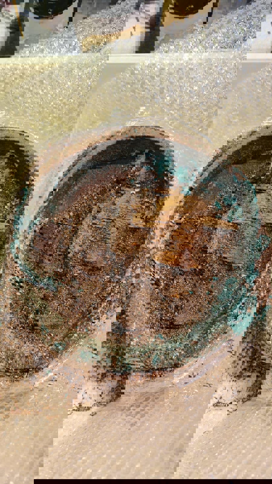 Bacile in bronzo con i resti di un cofanetto che conteneva acini e vinaccioli di un grappolo di uva trovato nella Tomba 58. Cortesia Fondazione Vulci