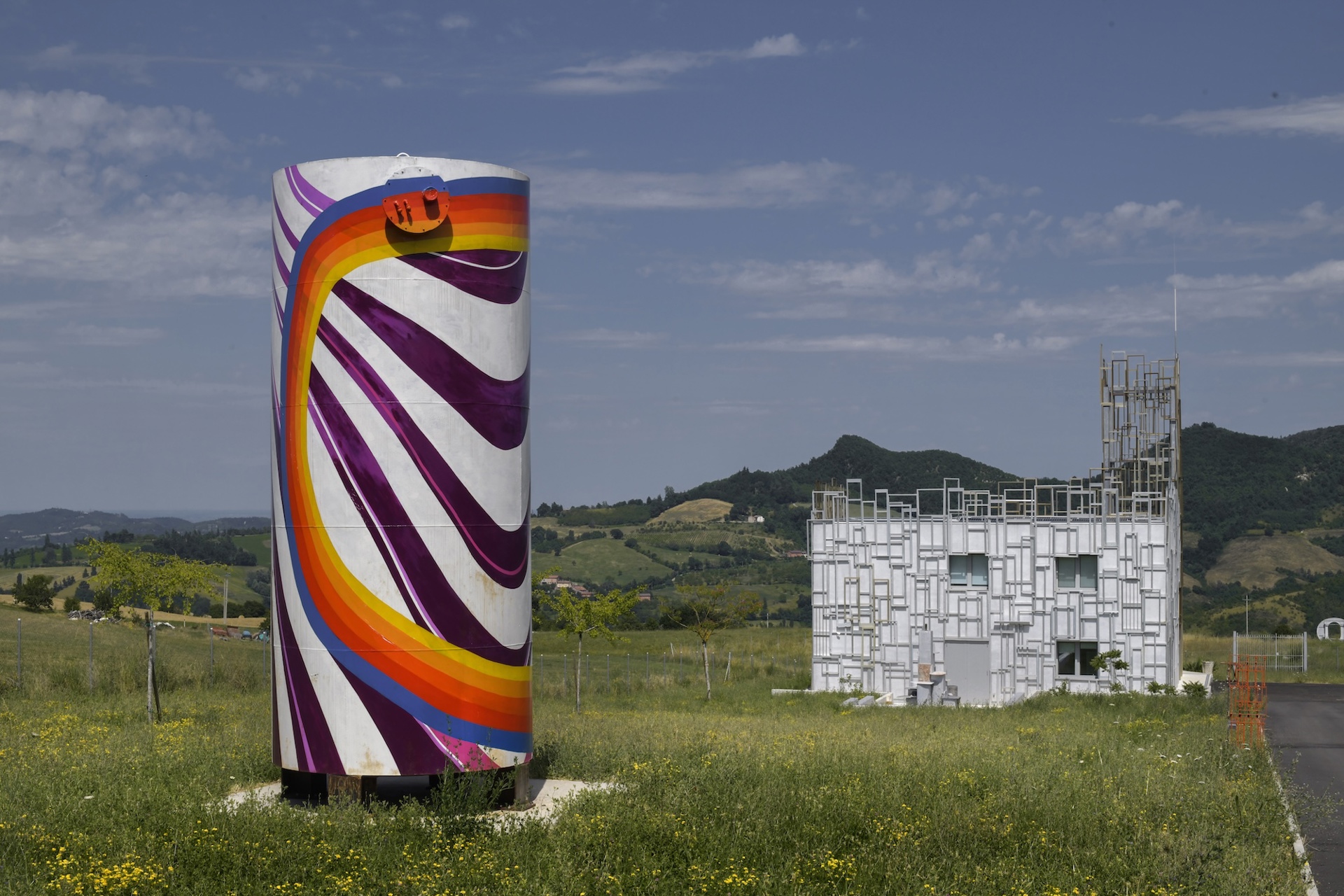 Ma il punto forte di questa casa d’artista, realizzata in collaborazione con Flavio Gardini architetto, Nobo Studio, Bologna e T2D (sponsor tecnico Würth), è l’immensa insegna del quotidiano «Il Giorno» installata alla fine del pendio. Un’opera che si illumina di notte per essere vista da lontano come un monumentale ossimoro. È il simbolo di quest’incursione quasi onirica che rompe l’uniformità di un piccolo altipiano, «un posto desueto, com’è l’Appennino bolognese, un posto per vecchi dove tutto è fermo, come il paesaggio che vedo dalle finestre...». Finché lui non lo ha spettinato e ribaltato.