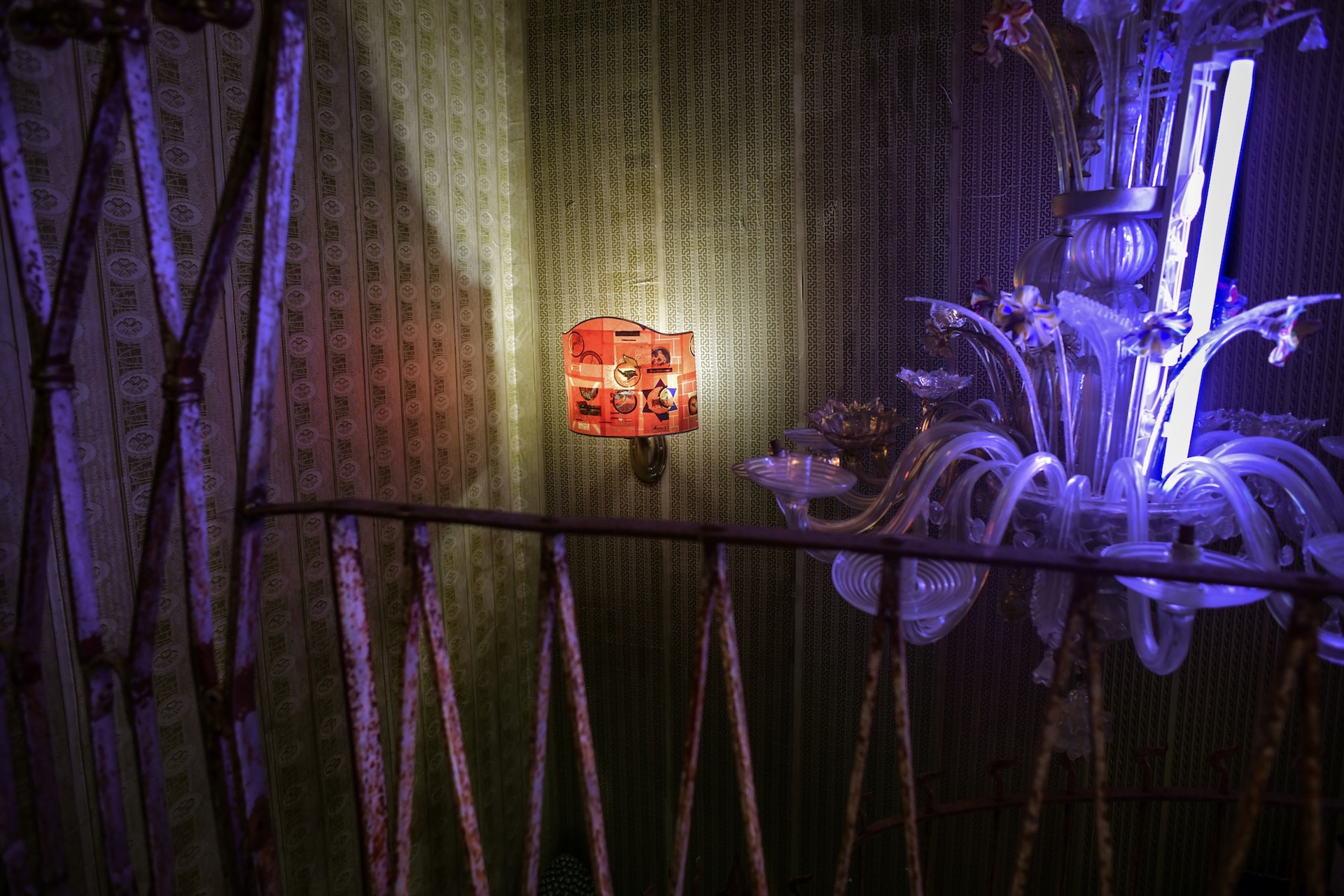 Bizzarra proprietà edificata su un terreno scosceso, composta da un edificio ricoperto di 500 metri quadrati di vecchi profili di porte e finestre in alluminio avvitati in maniera irregolare ai muri; una torre di 12 metri, totalmente vuota che fa il paio con un container-scultura e anch’esso lungo 12 metri e totalmente vuoto; una fontana, a un solo getto, costruita come un castello di carte con piani di marmi strappati a vecchi comodini e mobiletti; un garage in cemento simile a pensiline brutaliste dell’Unione Sovietica, mentre nel giardino orientaleggiante, tra piccoli palmeti e file di alberelli giapponesi, un assemblaggio di cancelli in ferro rievoca un grottesco gazebo e la grande cisterna dipinta rimanda al vecchio fustino del detersivo Dash. L’interno invece ha arredi da appartamento borghese con mobili e porte avorio, cementine primi Novecento, pavimento in legno ridipinto da Favelli con i decori orientaleggianti dei vasi dell’Amarena Fabbri.