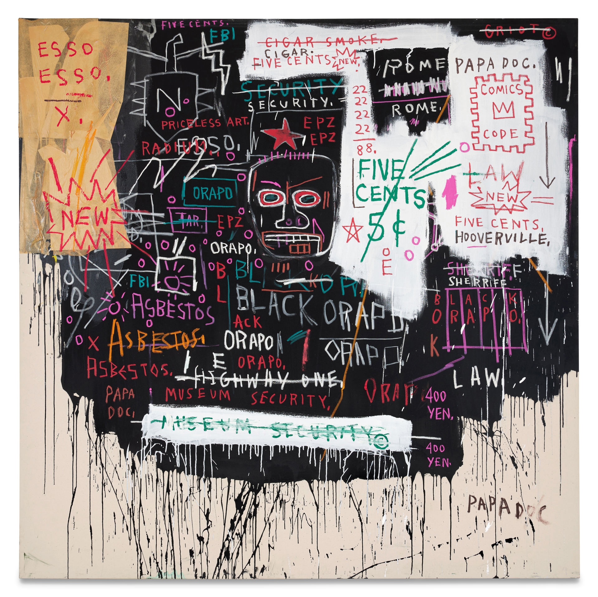 La tela si distingue per il linguaggio visivo stratificato, in cui parole, simboli e immagini si fondono in una composizione estremamente densa. Su una superficie monumentale, alta quasi due metri, Basquiat intreccia scritte e segni pittorici creando una struttura visiva che richiama l’immediatezza del graffitismo urbano. Tra le parole disseminate sulla tela compaiono espressioni come «Museum Security», «Priceless Art», «Yen», «Asbestos», «Hooverville» e «Five Cents», accanto a simboli ricorrenti dell’iconografia dell’artista come la celebre corona a tre punte e le stelle. Al centro della composizione emerge una figura che ricorda un teschio, caratterizzata da occhi contornati di rosso, elemento che contribuisce a creare un forte punto focale e una tensione emotiva particolarmente intensa.