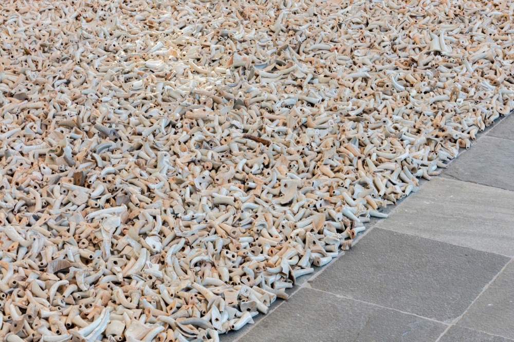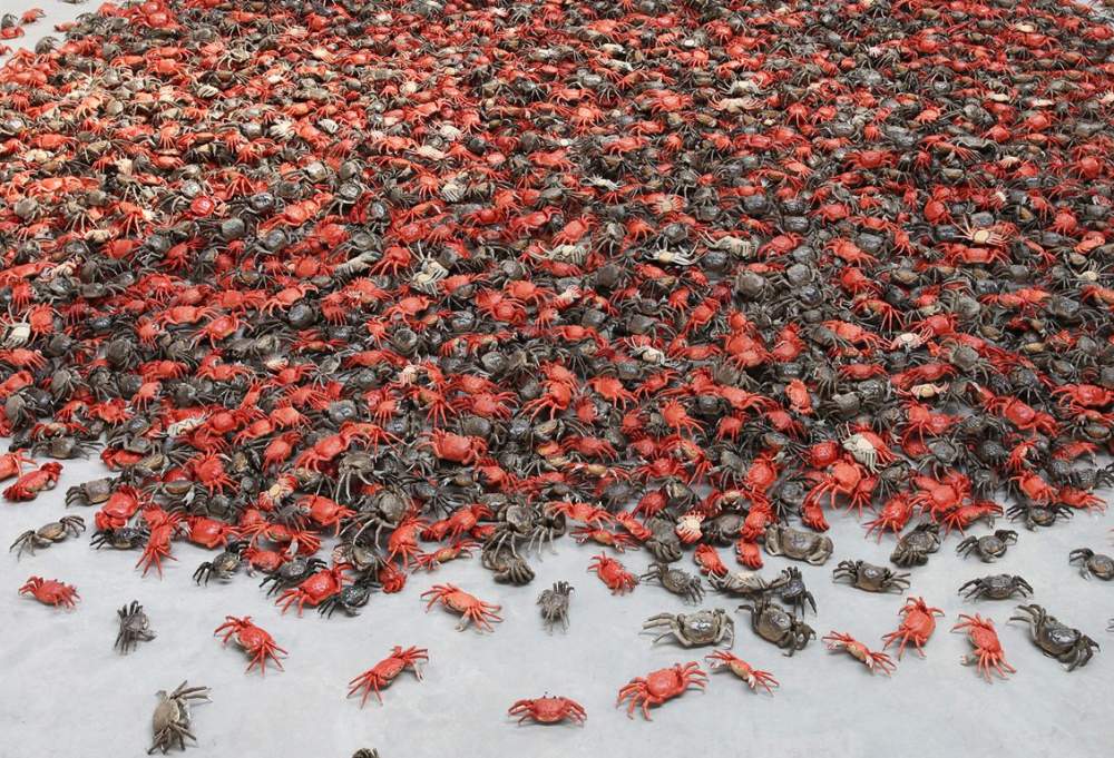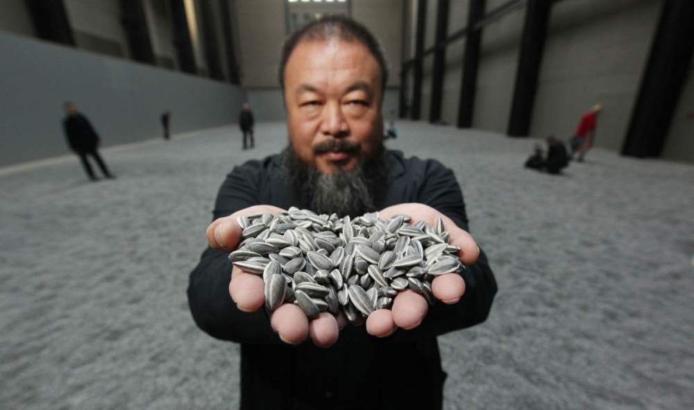 10mila beccucci di teiere antiche sono il materiale di «Spouts» (2015). 1.500 granchi in porcellana ricordano invece un party celebrato il 7 novembre 2010: si trattava di festeggiare il termine dei lavori e l’immediata distruzione di uno studio di Ai Weiwei a Shanghai, dov’era stato invitato dalle stesse autorità che poi, una volta ultimato l’edificio, ne ordinarono la demolizione perché non a norma («granchio» nella cultura cinese indica armonia, ma nello slang del web vale anche per censura); 100 milioni di semi di girasole di porcellana dipinti a mano, uno in maniera diversa dall’altro (i cinesi sembrano tutti uguali a noi occidentali, ma non è così), da 1.600 artigiani di Jingdexhen nel sud della Cina (il seme di girasole è parte importante dell’alimentazione cinese), vennero sparsi nell’ottobre del 2010 sul pavimento della Turbine Hall della Tate Modern di Londra.