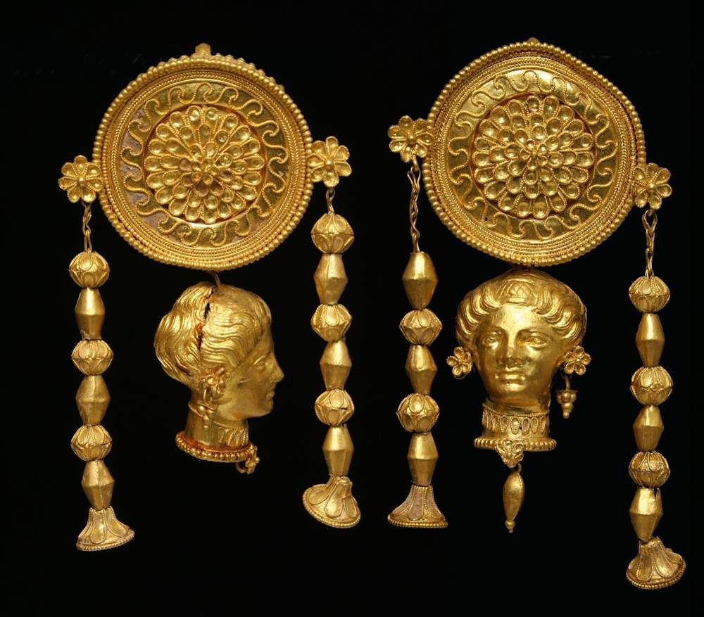 Orecchini a disco con pendenti a testa femminile in oro e smalti da una tomba di Crispiano (metà del IV secolo a.C.). Cortesia del Museo Archeologico Nazionale di Taranto - MArTA