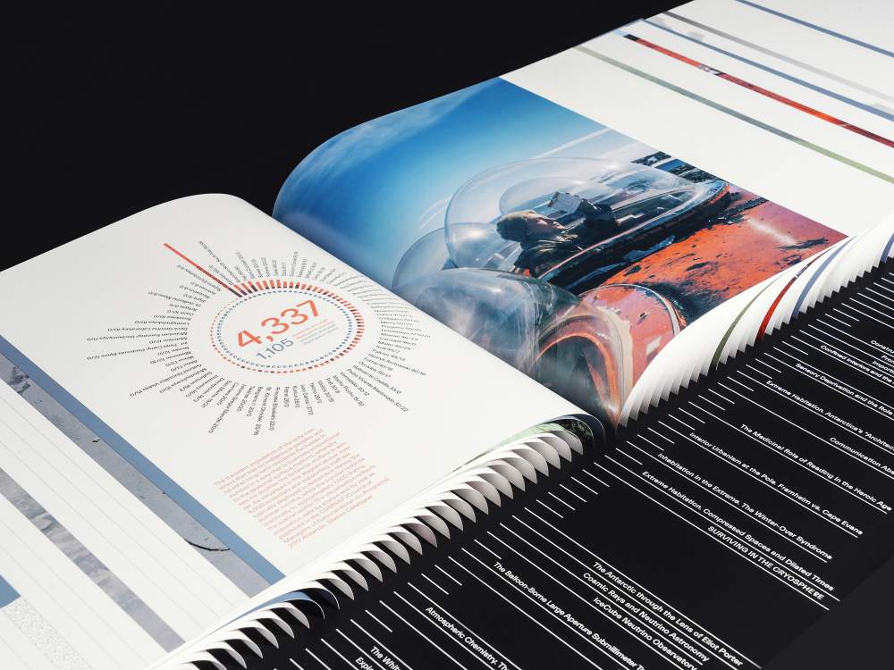 In mostra è presente in formato di «libro esploso» in cui le 1.000 pagine si susseguono formando un’installazione di sei metri di lunghezza, consentendo ai visitatori di recepire la complessità delle forze politiche e naturali che agiscono sui 26 quadrilioni di tonnellate di ghiaccio dell’Antartide. Accanto al volume sono esposti i singolarissimi «occhiali» indossati dal capitano Scott durante i sui eroici attraversamenti dell’Antartide (1901-04 e 1911-12) e l’«Antarctic Suit», prototipo di una tuta tecnologicamente all’avanguardia concepita dalla D-Air Lab per consentire maggiori possibilità di sopravvivenza umana in un ambiente in cui le temperature raggiungono i -89° C. L’assottigliamento della criosfera e il progressivo innalzamento del livello del mare sono denunciati dall’installazione di Arcangelo Sassolino, intitolata «250 volte al secondo», che evoca con eloquenza drammatica i suoni prodotti dalle fratture delle masse ciclopiche dei ghiacci dell’Antartide.