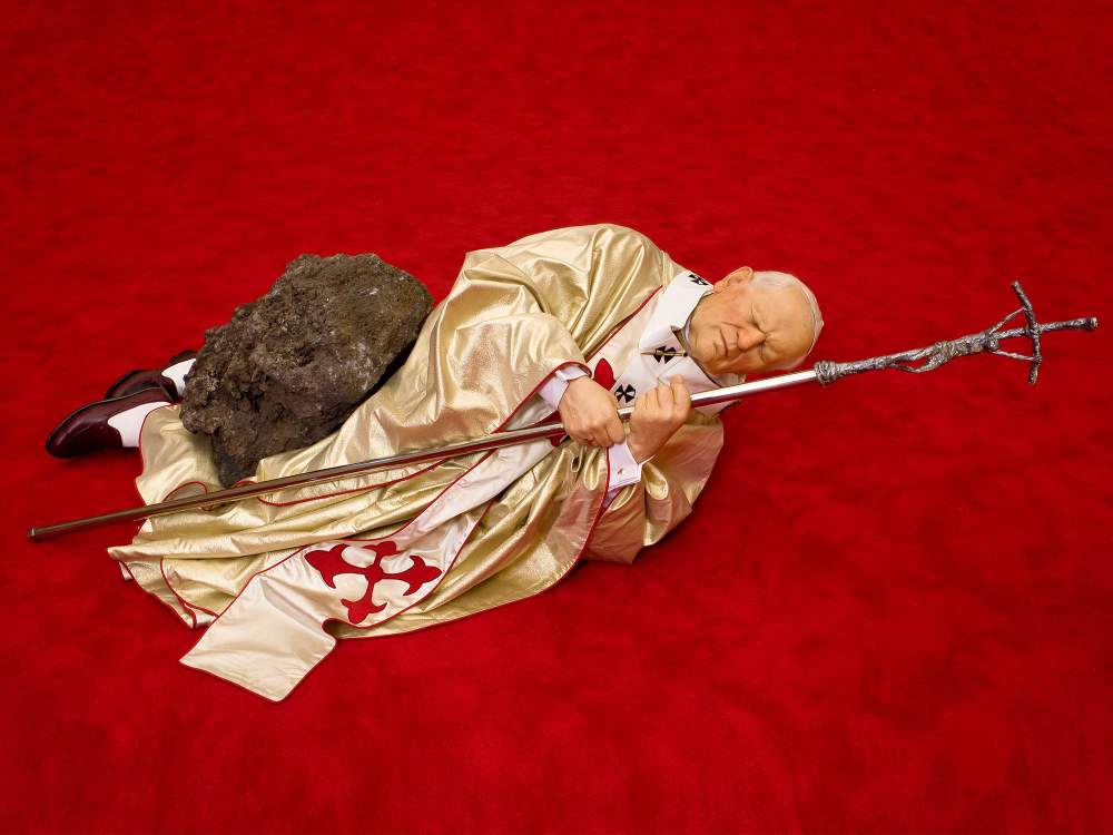 Come dice la giornalista Sarah Thornton, gli artisti nella nuova economia sono oggi tra i marchi più forti del mercato. Solo diventando un brand potrai imporre le immagini che produci, purché siano abbastanza forti. E Cattelan, una volta dismessi i panni di Spessotto, di pécio o di Forrest Gump, si rivela un micidiale mix tra Oliviero Toscani e Magritte. Ha una mostruosa facilità di creare opere da copertina: dopo «Novecento» sarà la volta di «Charlie Don’t Surf» (1997), la scultura del bambino con le mani inchiodate al banco da un paio di matite; poi arriva la «Nona Ora» (1999), il «papa santo subito», quel Karol Wojtyla, il pontefice ex attore nel quale probabilmente riconosceva straordinarie doti di comunicatore, colpito da un meteorite: pare che inizialmente dovesse stare in piedi, poi al duo Cattelan & Bonami venne in mente di spezzargli le gambe e farlo crollare a terra colpito da un masso cosmico.