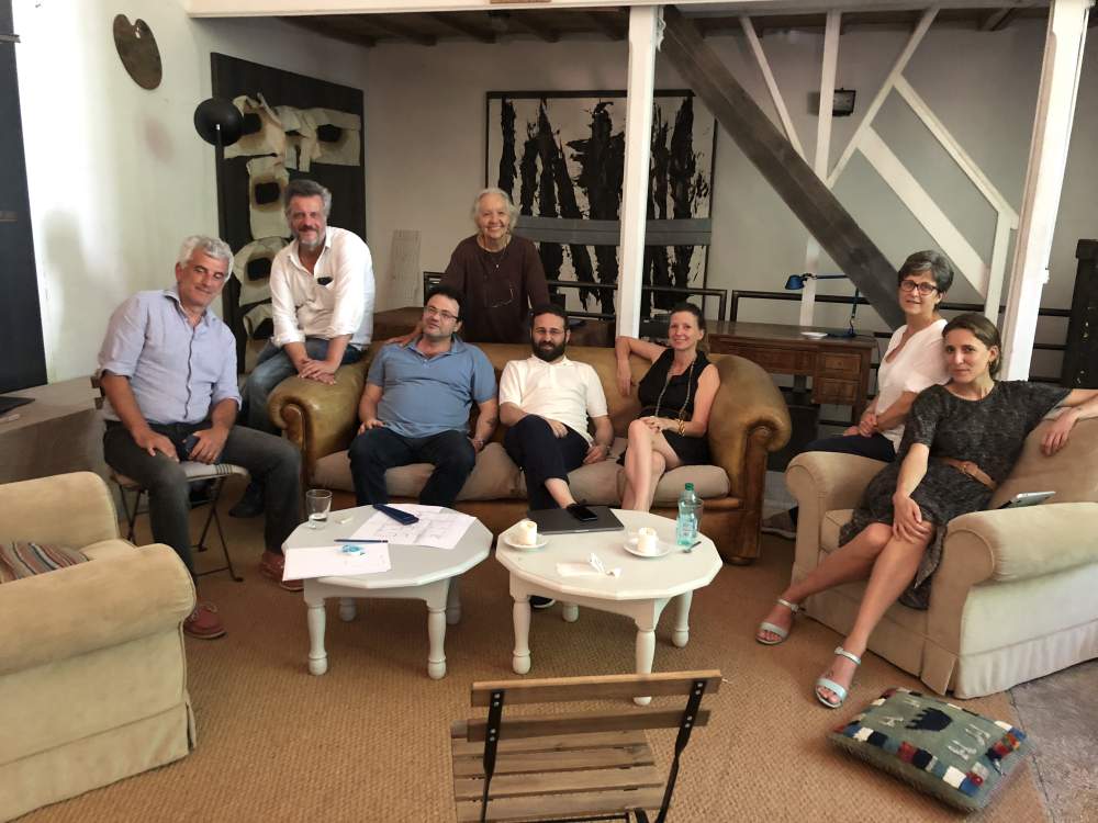 Da sinistra, il gallerista Niccolò Sprovieri, Damiano Urbani, direttore dell’Archivio Kounellis, Damiano Kounellis, presidente dell’Estate di Jannis Kounellis, Michelle Coudray, presidente dell’Archivio Kounellis, Vincenzo de Bellis, Valentina Palazzari, vicepresidente dell’Archivio Kounellis, Elisabetta Campolongo, archivista dell’Archivio Kounellis e Giulia Ruberti, gallerista, in occasione di una visita all’Archivio Kounellis durante la preparazione della retrospettiva di Jannis Kounellis al Walker Art Center nel luglio 2018