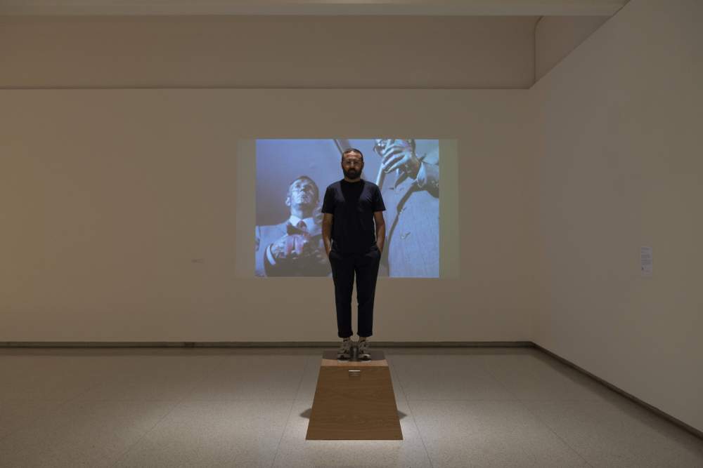 Vincenzo de Bellis sulla «Base Magica» (1961) di Piero Manzoni all’interno della mostra «The Paradox of Stillness: Art, Objects and Performance» al Walker Art Center di Minneapolis nell’aprile 2021
