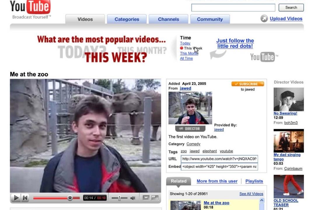 Dura appena 18 secondi «Me at the zoo», caricato il 23 aprile 2005, primissimo filmato apparso sulla piattaforma creata da tre amici e destinata a segnare una svolta nei contenuti generati dagli utenti e nei modi in cui i media potevano essere creati e consumati