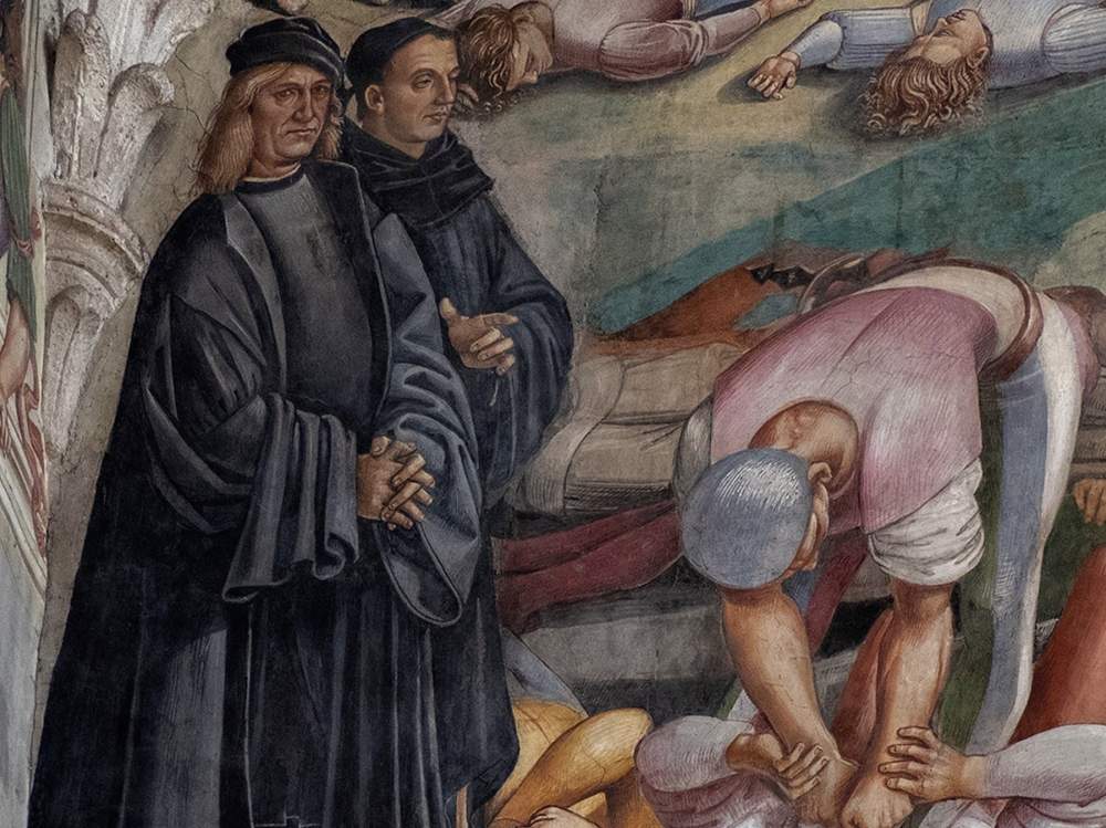 Chi è il monaco che accompagna l’autoritratto a figura intera di Luca Signorelli nell’affresco dei «Fatti dell’Anticristo» nella Cappella di San Brizio del Duomo di Orvieto?