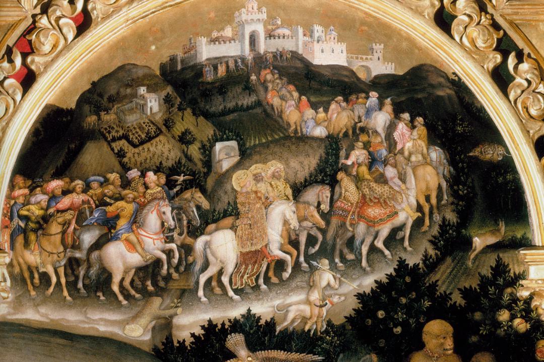 Entro l’arte di allora, i primi fanno trasportare in corteo i propri bauli carichi di merci preziose, mentre i secondi recano da sé pochi viveri e qualche fagotto