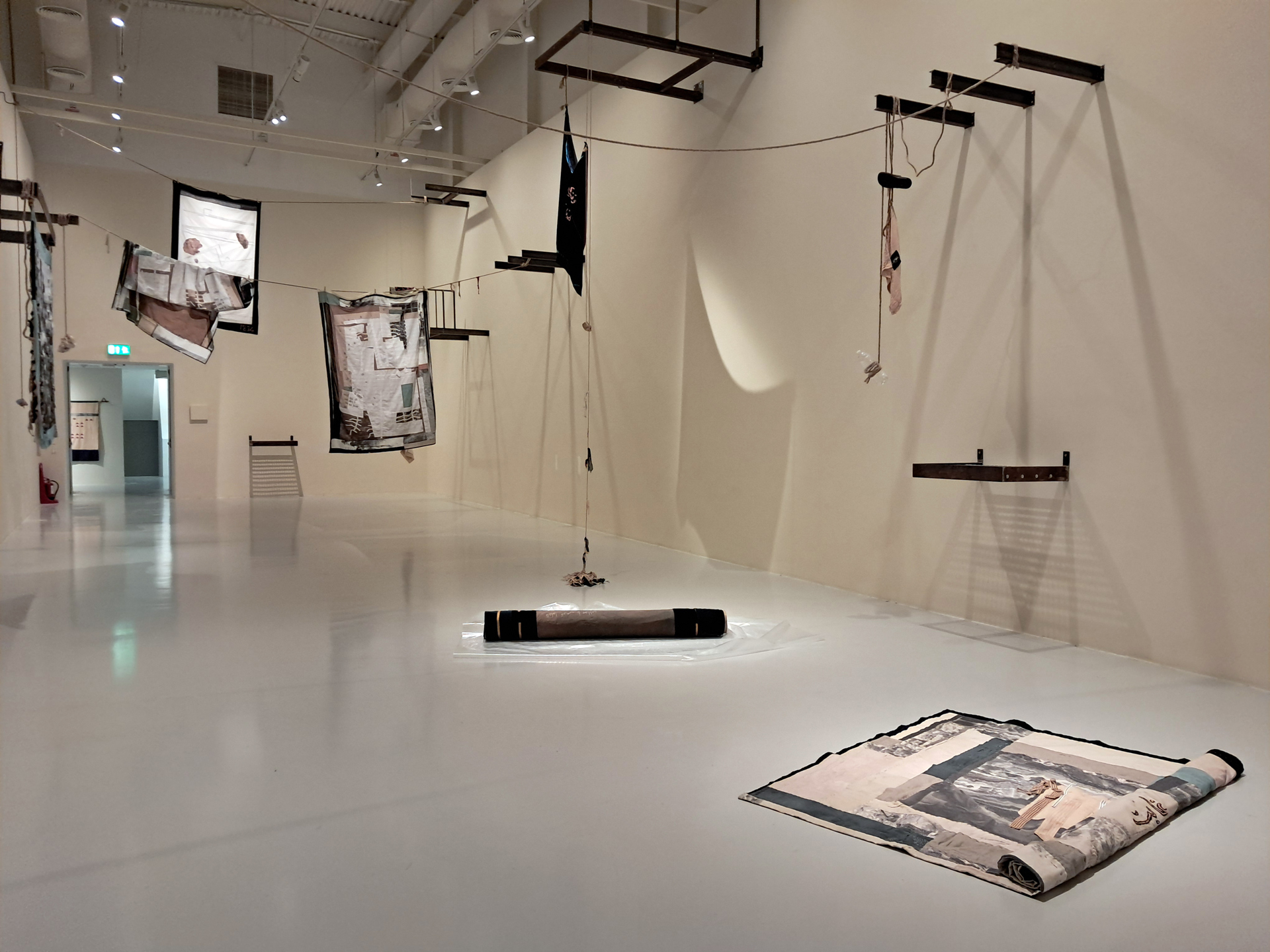 Il percorso inizia dalla ricerca «Refugee Heritage 2015-2025» di Daar-Decolonizing Architecture Art Research (la documentazione fotografica è di Luca Capuano, mentre il book design di Rosanna Lama), che ribalta il concetto convenzionale di eredità in relazione all’esperienza dei campi profughi palestinesi dopo la Nakba, per concludersi con la grande installazione «Your Time Passes And Mine Has No Ends» di Jumana Manna (commissionata unitamente da Hawai’i Triennial 2025 e Mathaf), che trasforma la sala del museo in uno spazio pubblico con i banner che ricordano i panni stesi su davanzali e balconi di un vicolo. L’artista visiva e filmmaker palestinese riporta su queste bandiere di tessuto frasi di prigionieri politici palestinesi, tra cui Walis Daqqa e la parlamentare, femminista e sostenitrice dei diritti dei prigionieri Khaleda Jarrar, creando un corpo collettivo in cui le voci sembrano rincorrersi tra un balcone e un davanzale.