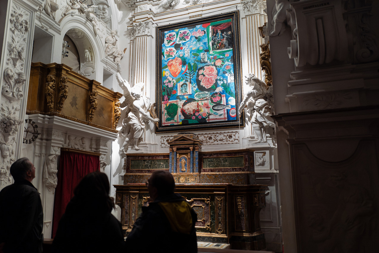 L’opera presentata all’Oratorio riprende le dimensioni originali della tela scomparsa, ma se ne distacca per linguaggio e struttura. Non ci sono scene riconoscibili, costruzioni narrative o iconografie tradizionali. La composizione è pensata come un accumulo di energia visiva, in cui forme e figure emergono e si dissolvono sotto le pennellate, al confine tra figurazione e astrazione. Alcuni simboli affiorano e ritornano -cuori, pesci, fiori- insieme a un riferimento alla Madonna del Rosario di Caravaggio, che compare nella parte alta del dipinto, discreto, quasi defilato.