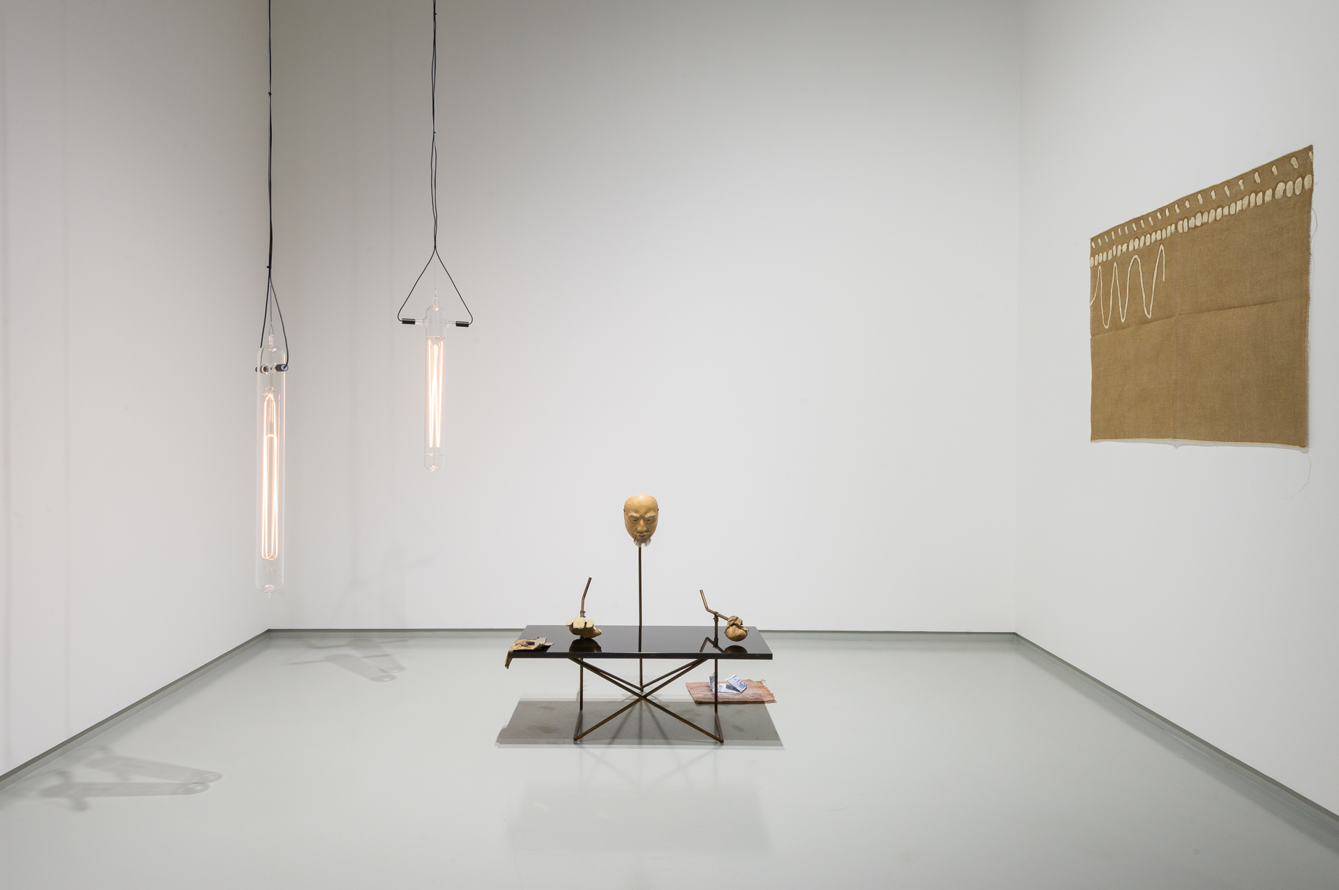La mostra è molto ben costruita: è suddivisa in cinque sezioni, ciascuna introdotta da una didascalia che riporta un dialogo (a cui le «D» del titolo si riferiscono) tra i due artisti. Analizzando la composizione di questi brevi testi si può intuire molto sull’attitudine dei due artisti: Griffa usa pochissime subordinate, con l’effetto che ogni parola impiegata acquisisce la medesima importanza e peso delle altre, e ogni elemento risulta in primo piano, proprio come i segni della sua pittura; Starling costruisce le sue frasi, così come i suoi lavori, come una serie di cause ed effetti concatenati, in cui ogni elemento è anello di un perpetuo circolo di trasformazioni e rimandi. L’approccio dell’artista inglese è evidente nell’opera «Head to Toe» (2017) esposta nella prima sala. Si tratta di un’installazione composta da più elementi connessi tra loro da legami logici e poetici: un ramo dell’albero da cui si estrae la resina per la lacca urushi è stato tagliato in modo che abbia la stessa altezza dell’artigiano che, usando il sopracitato pennello, ha applicato la lacca su una teca, la quale contiene un lingotto d’oro, stirato alla stessa lunghezza del suddetto ramo; una seconda teca con i vetri rossi (l’oro, aggiunto all’impasto di vetro fuso, lo colora di rosso) contiene il pennello; queste vetrine sono illuminate da una lampada fatta a mano che contiene un filamento di tungsteno incandescente lungo quanto il lingotto stirato (e il ramo, e l’artigiano); vicino al ramo, una fusione in tungsteno delle calzature che l’artigiano abitualmente indossa mentre lavora.