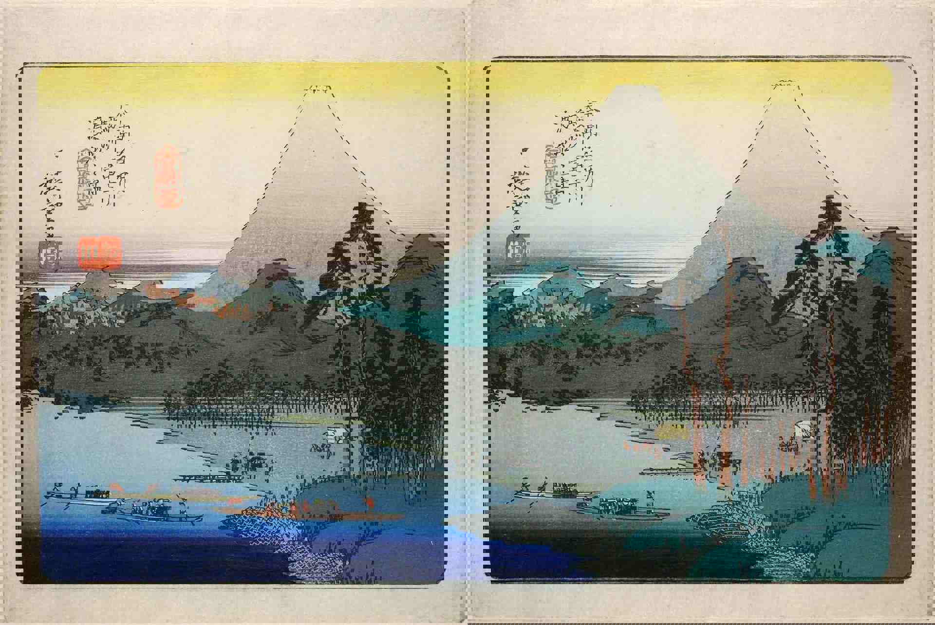 Utagawa Hiroshige, «Traghetto sul fiume Fuji, provincia di Suruga» da «Luoghi famosi del Giappone», 1832 ca. © The Trustees of the British Museum