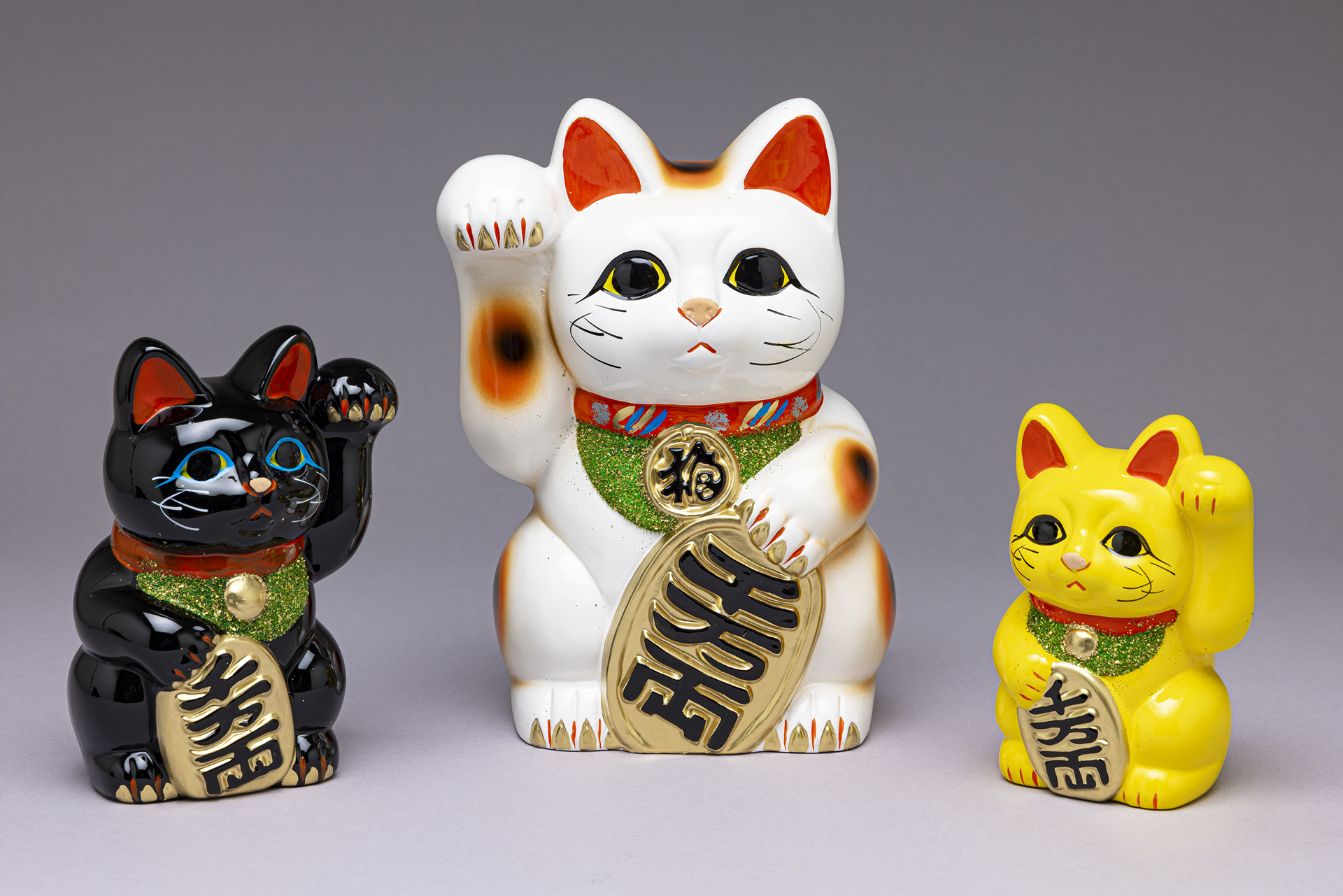 Maneki-neko, statuette Baigetsu Tomimoto-Ningyoen Tokoname, Prefecture Aichi, Giappone, 2025. © MARKK, Photo: Paul Schimweg
