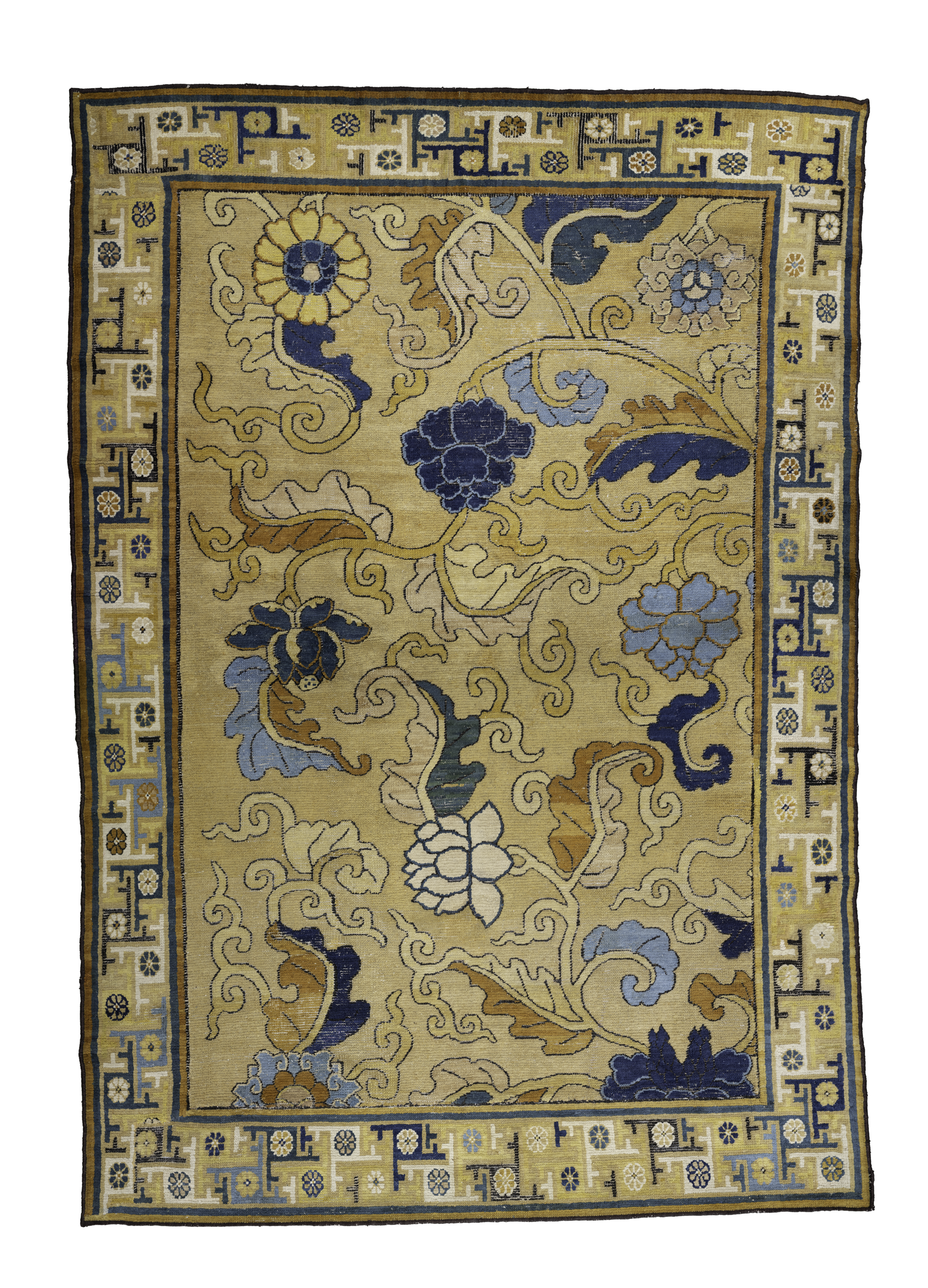 Resi con una «tavolozza» dominata dal giallo e dal blu nelle loro diverse sfumature (unica e rara eccezione il rosa pesca), in questi tappeti di pregiatissima fattura s’inseguono simboli e figure come il dragone, grande e terrifica «serpe» tradotta però in un segno sinuoso di grande eleganza; fiori di loto stilizzati; medaglioni dalle valenze filosofiche; croci uncinate, poi rese tristemente famose dal nazismo ma presenti qui nella loro simbologia solare originaria, portatrice di prosperità, e pipistrelli (tradotti in «sigle» concise ed efficaci) che in Cina sono considerati animali benevoli, portatori di felicità e di longevità. Ci sono poi crisantemi stilizzati, là simbolo di pace, con i loro petali arricciati su uno sfondo geometrico, come nel tappeto in mostra proveniente da Yarkant, città-oasi dello Xinjiang un tempo molto fiorente, che nell’alta bordura mostra il motivo mare-montagna-cielo, e ci sono l’unicorno, simbolo di lunga vita; la peonia, con i suoi petali carnosi, segno di nobiltà; la grassa carpa, che allude alla perseveranza; il cane leone cinese, legato al pensiero buddhista, che quando è realizzato in pietra è posto, a coppie, a minacciosa guardia dei palazzi e delle tombe imperiali, con un ruolo apotropaico di difesa dal male. Una vera «foresta di simboli», per parafrasare Baudelaire, nutrita dei principi del Buddhismo e del Taoismo, il cui messaggio è qui potenziato da un percorso sensoriale che include oggetti, parole tratte dal Taoismo scritte su fogli sospesi a telai di bambù, e profumi creati appositamente per questa mostra che evocano i fiori della tradizione cinese.
