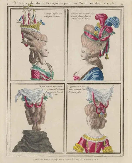 «Gallerie des modes et costumes français, 6e. cahier de Modes Françaises pour les Coeffures depuis 1776». F.31, ca 1778: «Nouvelle Coëffure dite la Frégate la Junon; Hérisson d’un nouveau gout orné de plumes fleurs et rubans avec des glands; Chignon en Croix de Chevalier surmonté d'un Bonnet au fichu bordé de perles; Chignon noué en trois parts, surmonté d'un Bonnet au fichu», una delle tavole in mostra dal primo aprile alla Frick Collection in «Ruffles & Ribbons: Fashion Plates from the Time of Marie Antoinette». Courtesy of The Frick Art Research Library