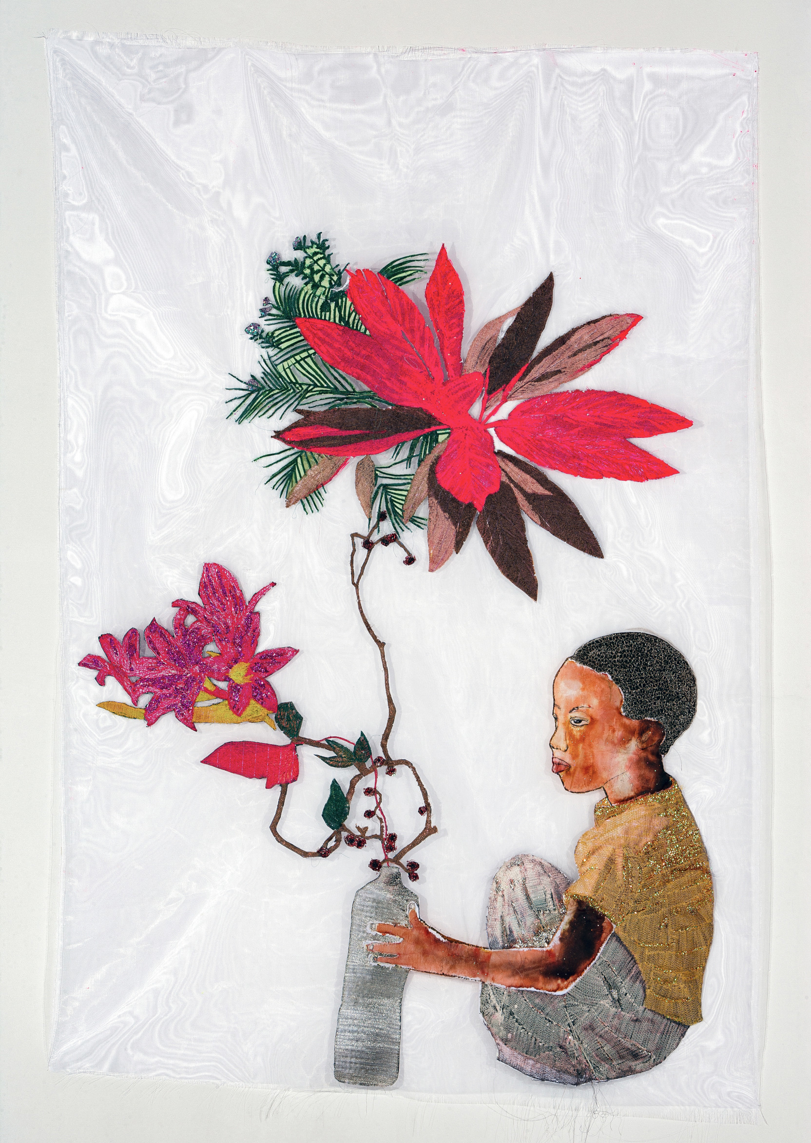 Intanto, allo Spazio Zero della GAMeC, dal 26 febbraio al 6 settembre viene presentato il progetto «Eau», in cui l’artista angolana-portoghese Ana Silva (Calulo, 1979) si confronta con il tema sempre più urgente dell’accesso all’acqua potabile. Plurale l’approccio a questa tematica dell’artista, che dapprima affida i soggetti da lei ideati a più ricamatori (uomini: gli unici cui in Angola sia concesso l’uso della macchina per cucire), riservando a se stessa l’ultima fase, in cui lei applica glitter e paillettes. Il supporto di questi ricami è la crinolina, quella garza rigida, originariamente ottenuta con il crine di cavallo, con cui in passato si confezionavano le ampie sottogonne che ne hanno tratto il nome. La pratica del ricamo rinvia alla cura, alla memoria e alla tradizione, e nello stesso tempo, con la sua delicatezza, richiama alla fragilità di un ecosistema in cui l’acqua diventa un bene sempre più raro e prezioso, un privilegio anziché un diritto quale dovrebbe essere.