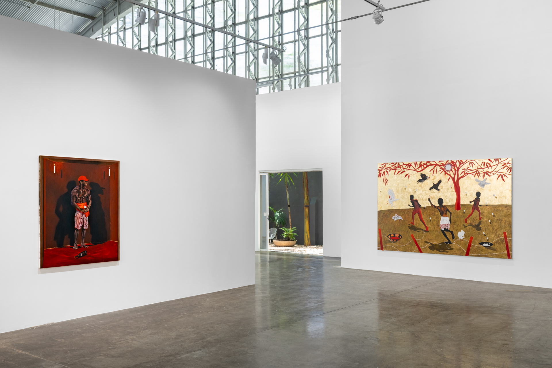 Lo scorso 18 novembre, da Sotheby’s New York, la sua «Alvorada - Música Incidental Black Bird», 2020, stimata tra i 100 e 150mila dollari, aveva rotto tutti i record, venduta per 1,02 milioni, superando di oltre dieci volte la stima minima. Eppure, Antonio Obá (Ceilândia, 1981, vive e lavora a Brasília) non è nuovo a questi voli: quest’ultima vendita infatti batte il precedente record d’asta dell’artista, fissato a 787.400 dollari, segnando un aumento del 325 per cento rispetto al suo precedente più illustre: «Sankofa - Figura Com Alpargata», anch’essa del 2020, venduta per 228.600 dollari, sempre da Sotheby's, il 14 maggio 2024. Il motivo di tale successo, per chi scrive, è presto detto: Antonio Obá è uno dei più talentuosi artisti brasiliani della sua generazione e la personale, «Nascimento» (fino al 28 febbraio) , nella sede paulistana della galleria Mendes Wood DM, è assolutamente imperdibile. Dopo Paulo Nazareth, anche Obá occupa tutti gli spazi del «galpão» di Barra Funda, confrontandosi con lo spazio e la luce e, contemporaneamente, aprendo a una nuova politica espositiva di Mendes Wood DM, offrendo ai propri artisti la possibilità di realizzare mostre di carattere museale. Così, dopo aver lasciato l’artista al CAC di Ginevra lo scorso inverno, con la splendida «Rituals of care», lo ritroviamo nuovamente con tutta la sua potenza: «Credo che l’idea che abbia alimentato la mostra sia arrivata in anticipo, con il titolo, Nascimento. A dir la verità credo sia la prima mostra in cui il titolo si è imposto da solo, si è manifestato. Così, in un certo senso, tutte le opere testano un pensiero intorno a questa idea di nascita, a un momento che dà origine a qualcosa ma, soprattutto, ai vari percorsi e smarrimenti che iniziano ad accadere da quel momento, da questo nascere, dalle varie vie che la vita ci offre», ci racconta l’artista. E i cammini sono tracciati ben dal principio: «Nascimento» si apre attraversando due aree verdi occupate da un lato dalle foglie della Spada di San Giorgio e, dall’altro, quella di Santa Barbara, entrambe simbolo di coraggio e rinnovamento, fermezza e protezione, maschile e femminile. Da qui, il percorso che si apre non è circolare né lineare, ma simboli, colori e forme dialogano e si intrecciano con la storia dell'arte: bizantina, romana, rinascimentale, traslandone l'immaginario su un piano che ha a che fare con la capacità di sintesi o, si potrebbe dire, con una certa idea di sincretismo. Tra le opere più brillanti, «Situação terreiro: estripulia», 2025: tre bambini correndo verso la fine di un giardino, un fondo oro come cielo e altri pochissimi colori: il bianco delle uova, il rosso di un grande albero e del sangue raccolto in un piatto per offerte: «Ispirandomi a una storia famigliare di tre bambini estremamente vivaci, la cui madre toglieva loro i vestiti per cercare di calmarli con l'imbarazzo, invano, diventa in questo caso una ricerca che fa anche riferimento ai colori di Exú (figura della comunicazione che si pone tra il piano spirituale e quello materiale, responsabile della vitalità, del movimento e dell'applicazione della legge, appartenente ai culti di matrice africana, come Candomblé e Umbanda, Ndr), ma non solo. C’è un’ambientazione riferita anche ai colori che sono molto demarcati nell'alchimia: il rosso, il nero, il giallo, il bianco, che denotano un carattere di trasmutazione. Una vita che ci sta chiedendo un impeto, il coraggio di rompere i recinti e avanzare», racconta ancora Obá.