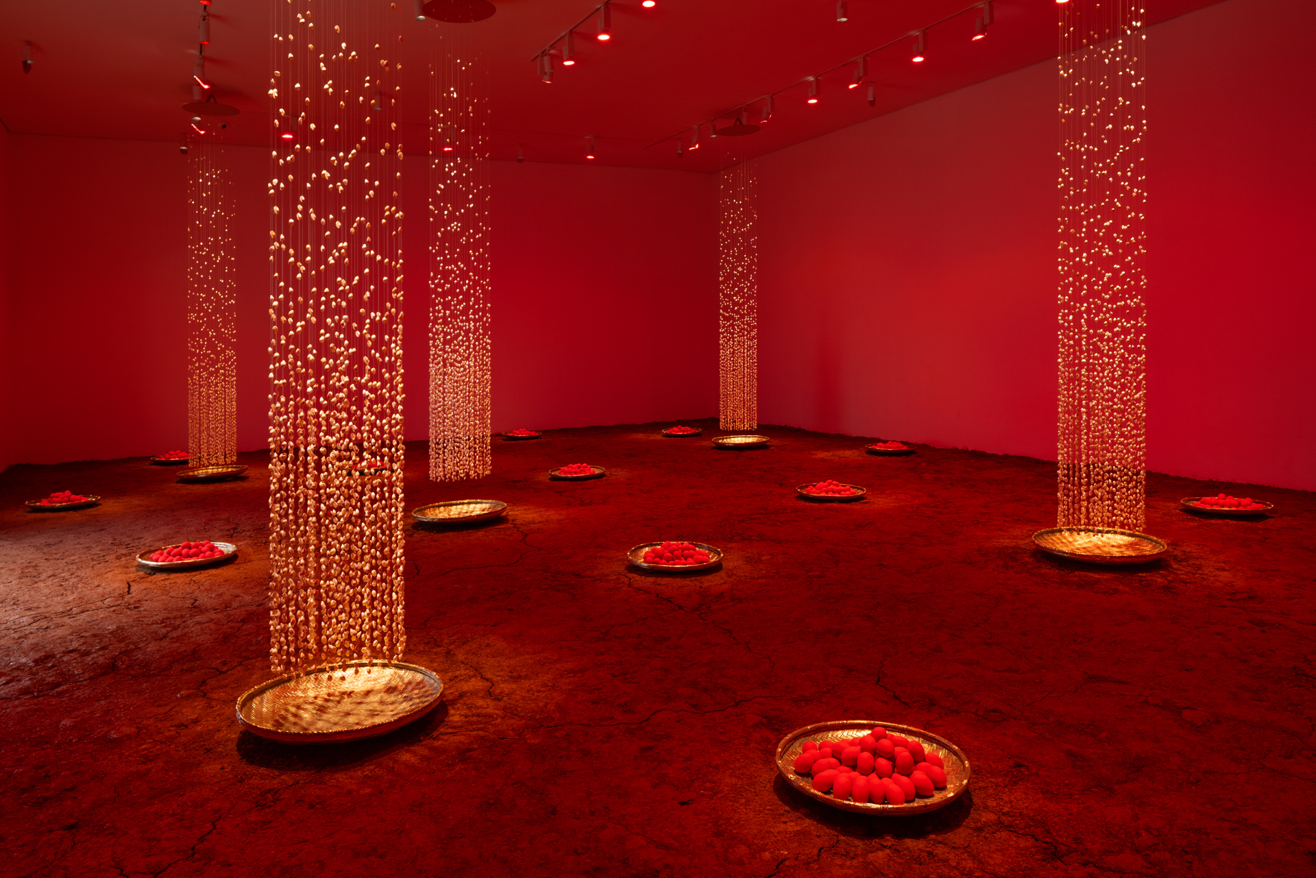 Un passo che sembra appartenere alla letteratura di Walter Hugo Mãe, uno degli autori portoghesi viventi più celebrati: «Cercavo di calmarmi, come a fermare il battito del proprio cuore. La mia natura era quella del movimento. Quasi sempre mi muovevo prima di sapere per dove o per che ragione. La mente non era mai più rapida che i nervi nel corpo. La mente aspettava ragioni e spiegazioni, il corpo seguiva la vertigine. Ero un animale attivato per la semplice evidenza di pulsare», scrive l’autore nelle vesti di Paulinho, nel romanzo Deus na escuridão. Nella grande installazione «Situação terreiro: acese», 2025, che occupa una intera area della galleria, uova rosse in cestini adagiati su terra battuta, soggetta alle modificazioni atmosferiche, alle cui sommità cala una pioggia di búzios (la conchiglia monetaria, utilizzata nei rituali di matrice africana e anticamente come valuta, ndr): «Tutti questi simboli si riferiscono a una memoria collettiva. Non sono vincolati a geografie né a epoche, nonostante si possa percepire un chiaro riferimento a certe tradizioni afro-brasiliane, come il gioco dei búzios. Però, anche in questo caso, l'uso del colore, il rosso, denota il momento di trasmutazione della materia. Anche in questo caso, i miei riferimenti junghiani giocano su un piano di coscienza e di trasformazione individuale. Questa porzione di terra, viva, è certamente destinata al culto, ma anche al lavoro. E tutto questo rosso, a cui la percezione deve abituarsi, emula profondità dinamiche, è quasi un pulsare. È quasi come entrare in un utero, in un ambiente che è vivo e non costante», spiega ancora l’autore brasiliano, che dichiara anche di lavorare attraverso un processo «misto».