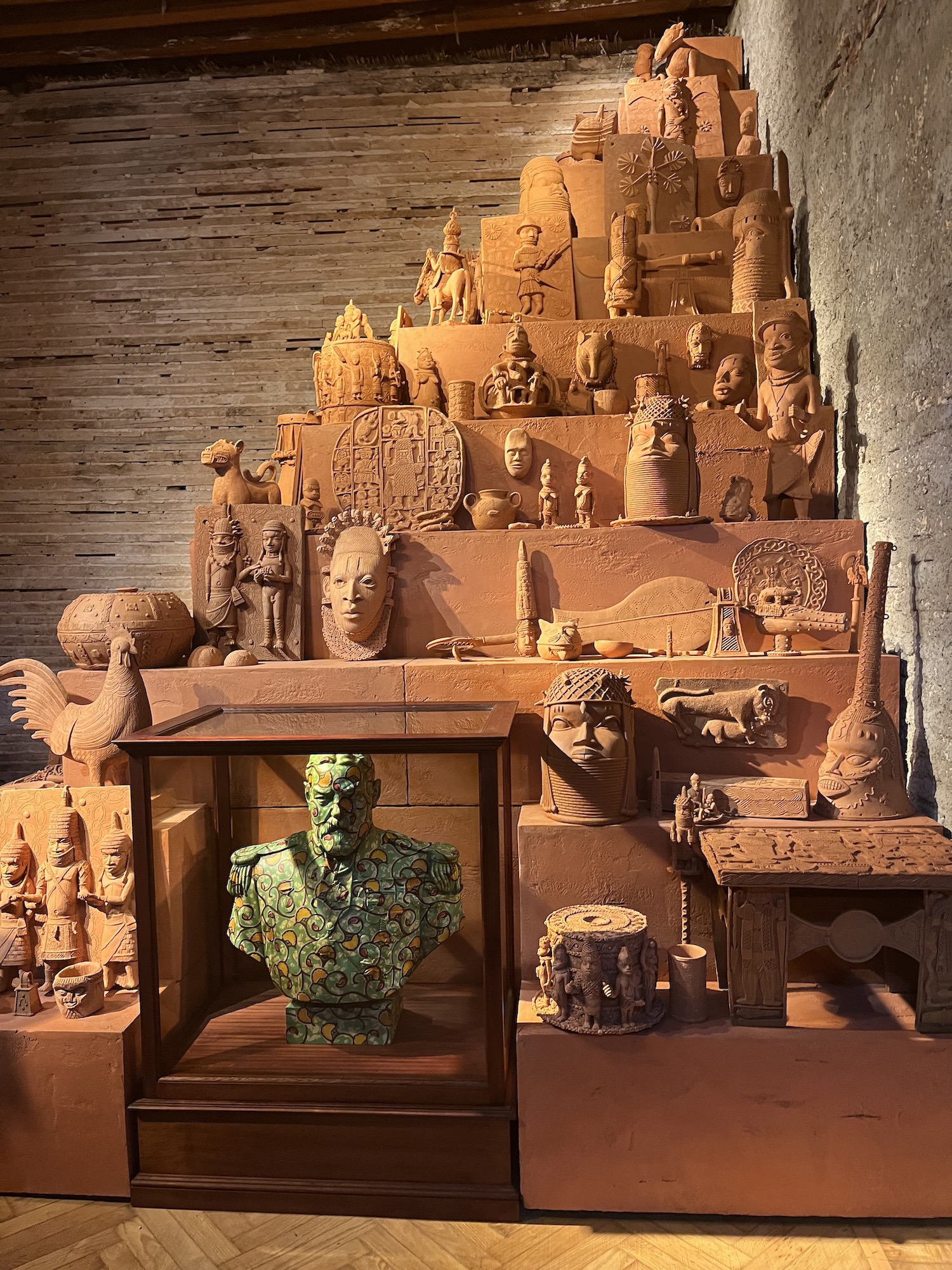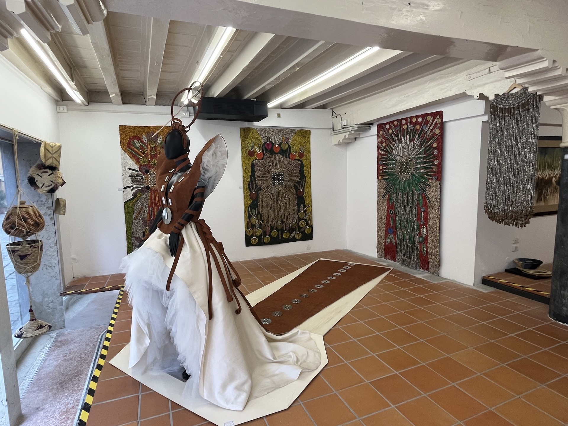 Appena girato l’angolo ci si imbatte nella Costa d’Avorio (Dorsoduro 947) e «The Blu Note»: con il colore blu tiene insieme le opere dei diversi artisti, un «particolare colore che mancava al sistema occidentale. È ciò che ci permette di cantare la solitudine e la fatica della vita, ma anche la speranza. È la nota che ha permesso agli africani di sopravvivere e vivere». Profondo e complesso è il Padiglione della Nigeria (tra campo San Barnaba e Campo Santa Margherita in Palazzo Canal, Rio Terà Canal, Dorsoduro 3121): le opere di otto artisti costruiscono una ideale rievocazione a sessant’anni di distanza dello Mbari Club, punto di incontro culturale tra scrittori, artisti e musicisti, per immaginare una nuova Nigeria, riflettendo sul passato.